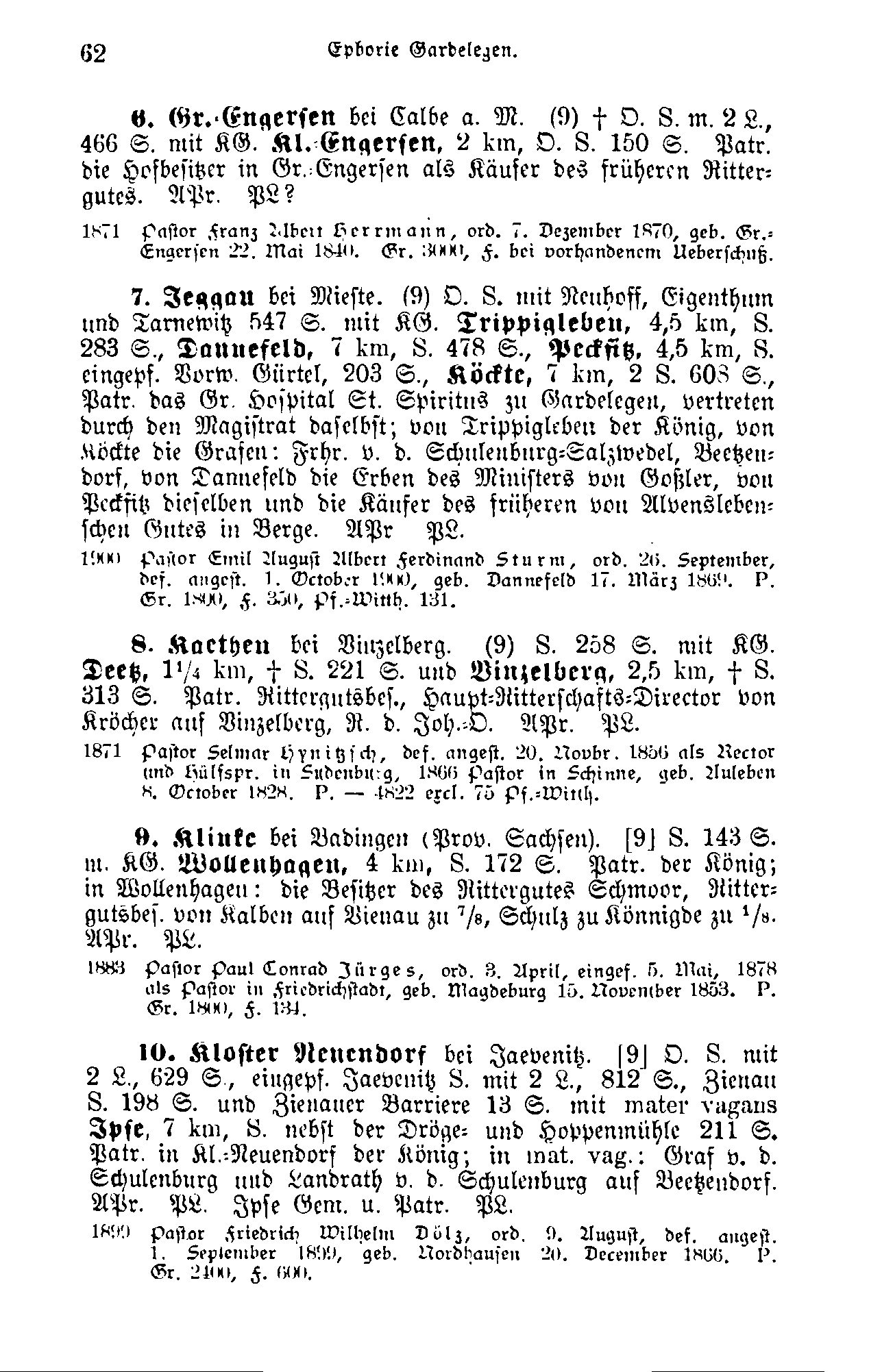 Groß Engersen bei Calbe an der Milde, Rittergut, Orgel, Schule, mit zwei Lehrern 466 Seelen mit Kirchengemeinde Klein Engersen, 2 km, Orgel, Schule, 150 Seelen, Patron die Hofbesitzer in Groß Engersen als Käufer früheren Rittergutes, Kirchenordnung: Altmärkisch Preußisches Recht. Die patronatische Lastenpflicht ist zu verneinen, oder zweifelhaft, oder noch unerörtert.