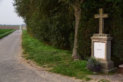 Dieses schlichte Kreuz steht rechts unter einer Buche in der Feldflur.