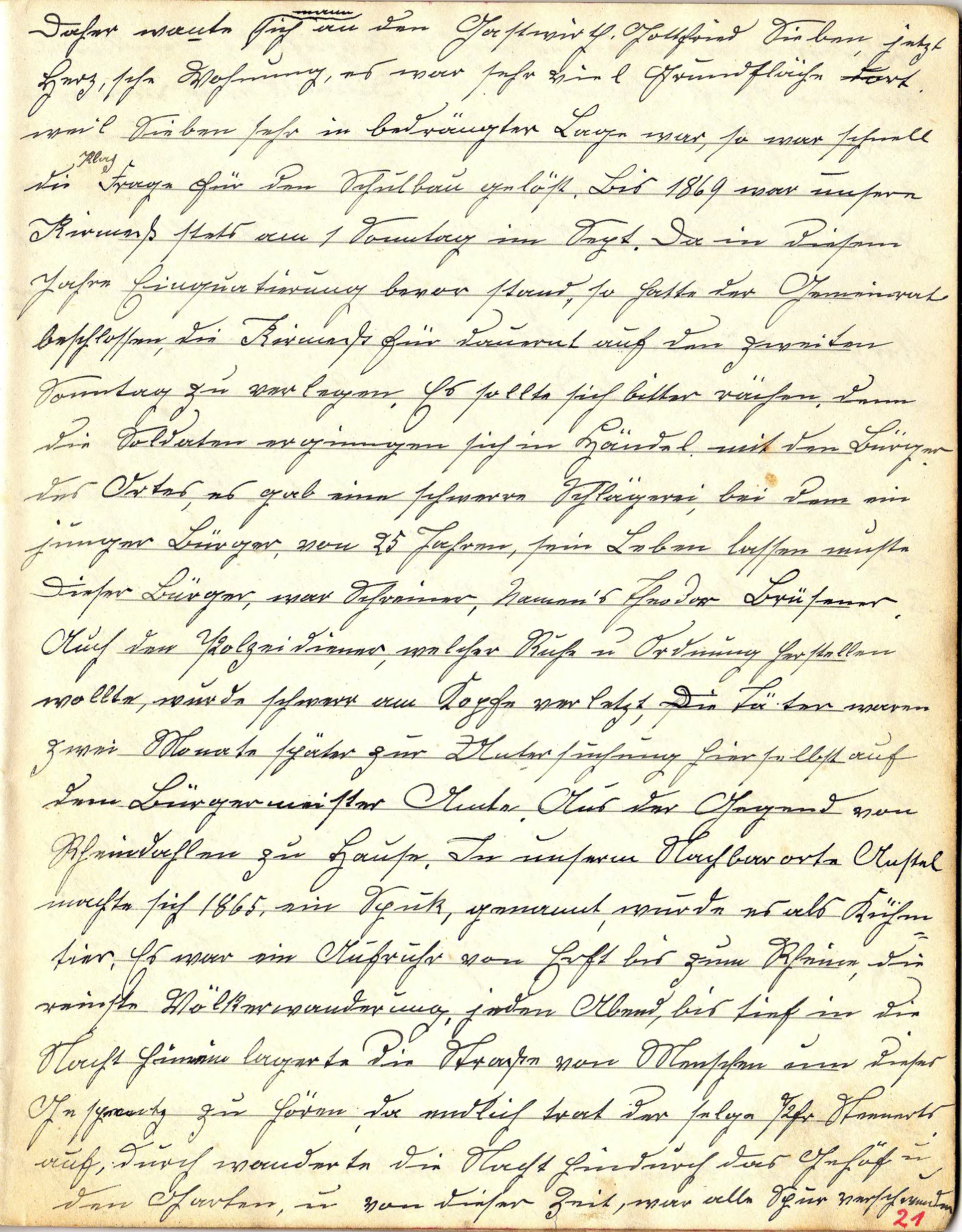 Daher wandte man sich an den Gastwirt Gottfried Sieben, jetzt Herz’sche Wohnung, es war sehr viel Grundfläche dort. Weil Sieben sehr in bedrängter Lage war, so war schnell die Platz Frage für den Schulbau gelöst. Bis 1869 war unsere Kirmes stets am 1. Sonntag im Sept. Da in diesem Jahre Einquartierung bevor stand, so hatte der Gemein(de)rat beschlossen, die Kirmes für dauernd auf den zweiten Sonntag zu verlegen. Es sollte sich bitter rächen, denn die Soldaten ergingen sich in Händel mit den Bürgern des Ortes, es gab eine schwere Schlägerei, bei dem ein junger Bürger, von 25 Jahren, sein Leben lassen musste. Dieser Bürger war Schreiner, namens Theodor Brüsener. Auch der Polizeidiener, welcher Ruhe u. Ordnung herstellen wollte, wurde schwer am Kopfe verletzt. Die Täter waren zwei Monate später zur Untersuchung hierselbst auf dem Bürgermeister Amte. Aus der Gegend von Rheindahlen zu Hause. In unserm Nachbarorte Anstel machte sich 1865 ein Spuk, genannt wurde es als Kühmtier. Es war ein Aufruf von Erft bis zum Rhein, die reinste Völkerwanderung, jeden Abend bis tief in die Nacht hinein lagerte die Straße von Menschen, um dieses Gespenst zu hören. Da endlich trat der sel’ge Pfr. Steenarts auf, durchwanderte die Nacht hindurch das Gehöft u. den Garten u. von dieser Zeit war alle Spur verschwunden.