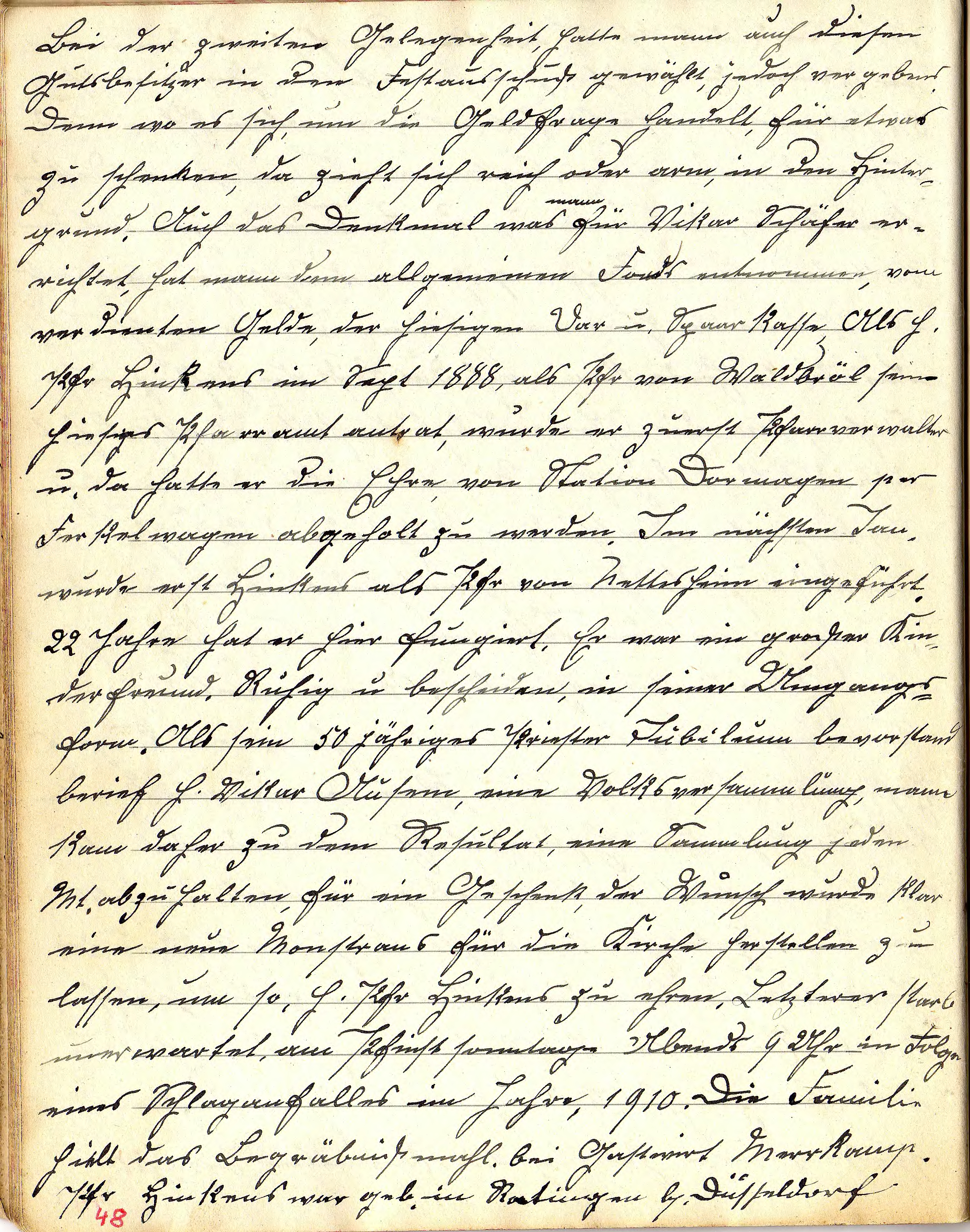 Bei der zweiten Gelegenheit hatte man auch diesen Gutsbesitzer in den Festausschuss gewählt, jedoch vergebens. Denn wo es sich um die Geldfrage handelt für etwas zu schenken, da zieht sich reich oder arm in den Hintergrund. Auch das Denkmal, was man für Vikar Schäfer errichtet, hat man dem allgemeinen Fonds entnommen, vom verdienten Gelde, der hiesigen Dar- und Sparkasse. Als H. Pfr. Hinkens im Sept. 1888 als Pfr. von Waldbröl sein hiesiges Pfarramt antrat, wurde er zuerst Pfarrverwalter u. da hatte er die Ehre von Station Dormagen per Ferkelwagen abgeholt zu werden. Im nächsten Jan. wurde erst Hinkens als Pfr. von Nettesheim eingeführt. 22 Jahre hat er hier fungiert. Er war ein großer Kinderfreund. Ruhig u. bescheiden in seiner Umgangsform. Als sein 50jähriges Priesterjubiläum bevorstand berief H. Vikar Ausem eine Volksversammlung, man kam daher zu dem Resultat, eine Sammlung jeden Mt. abzuhalten für ein Geschenk, der Wunsch wurde klar eine neue Monstranz für die Kirche herstellen zu lassen, um so H. Pfr. Hinkens zu ehren. Letzterer starb unerwartet am Pfingstsonntage Abends 9 Uhr in Folge eines Schlaganfalles im Jahre 1910. Die Familie hielt das Begräbnismahl bei Gastwirt Merrkamp. Pfr. Hinkens war geb. in Ratingen bei Düsseldorf.
