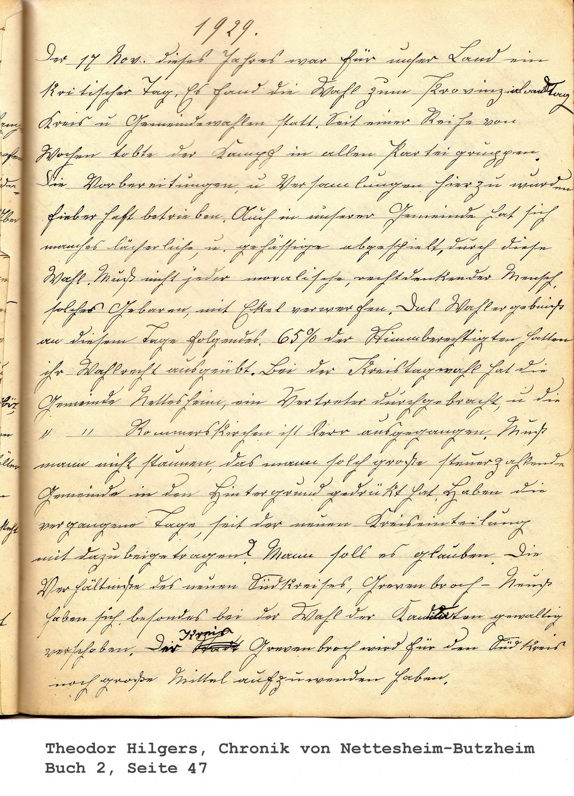 Der 17 Nov. dieses Jahres war für unser Land ein kritischer Tag. Es fand die Wahl zum Provinzialandtag Kreis u. Gemeindewahlen statt. Seit einer Reihe von Wochen tobte der Kampf in allen Parteigruppen. Die Vorbereitungen, u. Versamlungen hierzu wurden fieberhaft betrieben. Auch in unserer Gemeinde hat sich manches lächerliche, u. gehässige abgespielt, durch diese Wahl. Muß nicht jeder moralische, rechtdenkender Mensch, solches Gebaren, mit Ekel verwerfen. Das Wahlergebniß an diesem Tage folgendes. 65% der Stimmberechtigten hatten ihr Wahlrecht ausgeübt. Bei der Kreistagwahl hat die Gemeinde Nettesheim, ein Vertreter durchgebracht, u. die (Gemeinde) Rommerskirchen ist lerr ausgegangen. Muß mann nicht staunen, das mann solch große steuerzahlende Gemeinde in den Hintergrund gedrükt hat. Haben die vergangene Tage, seit der neuen Kreiseinteilung mit dazu beigetragen? Mann soll es glauben. Die Verhältniße des neuen Südkreises, Grevenbroch-Neuß haben sich besondes bei der Wahl der Kandidaten gewaltig verschoben. Der Stadt Kreis Grevenbroch wird für den Südkreis noch große Mittel aufzuwenden haben.