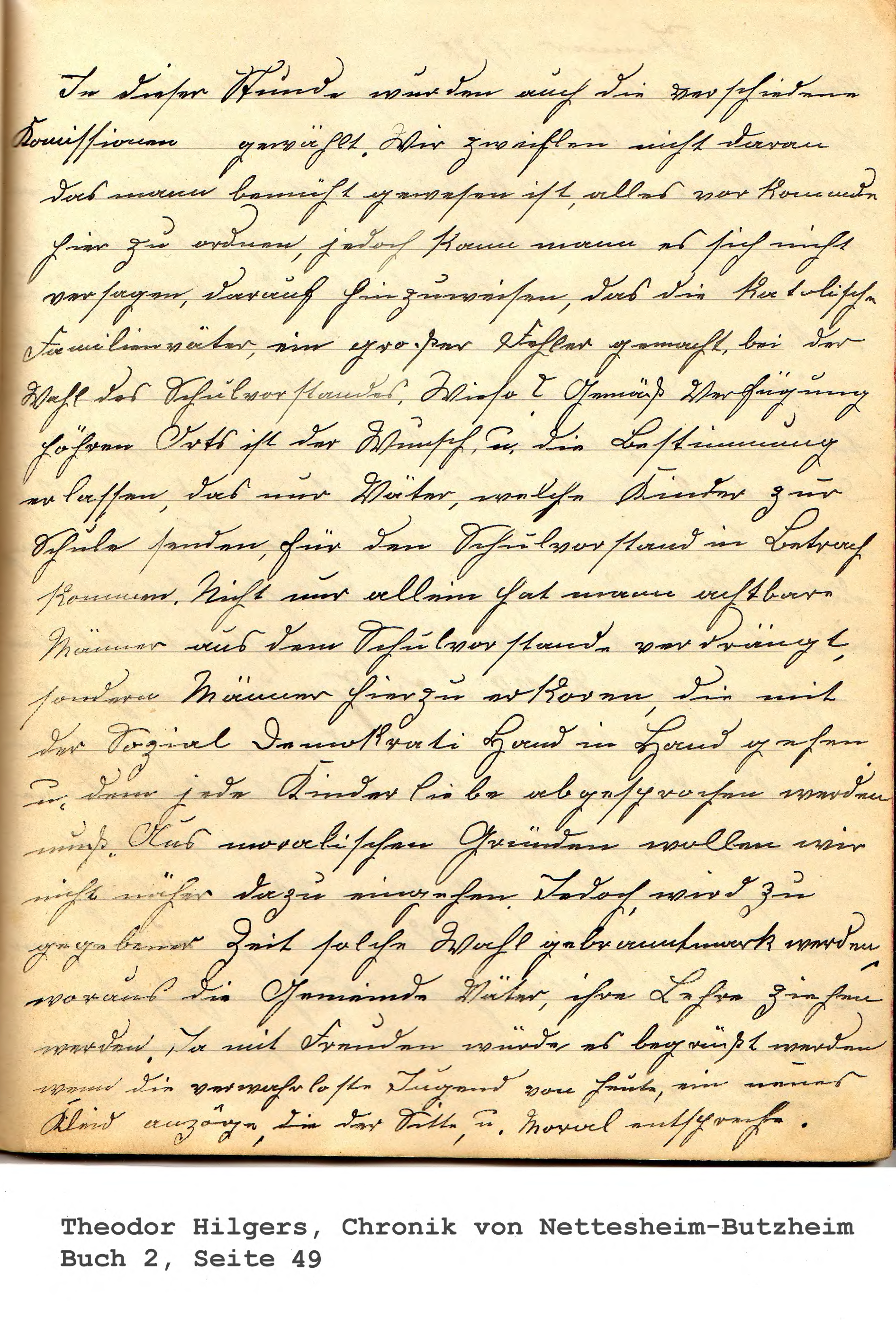 In dieser Stunde wurden auch die verschiedene Komissionen gewählt. Wir zweiflen nicht daran das mann bemüht gewesen ist, alles vorkomende hier zu ordnen, jedoch kann mann es sich nicht versagen, darauf hinzuweisen, das die katolische Familienväter, ein großer Fehler gemacht, bei der Wahl des Schulvorstandes. Wieso? Gemäß Verfügung höhren Orts ist der Wunsch, u. die Bestimmung erlassen, das nur Väter, welche Kinder zur Schule senden, für den Schulvorstand in Betrach kommen. Nicht nur allein hat mann achtbare Männer aus dem Schulvorstande verdrängt, sondern Männer hierzu erkoren, die mit der Sozial Demokrati Hand in Hand gehen u. dem jede Kinderliebe abgesprochen werden muß. Aus moralischen Gründen wollen wir nicht näher dazu eingehen. Jedoch, wird zu gegebener Zeit solche Wahl gebranntmark werden, woraus die Gemeinde Väter, ihre Lehre ziehen werden. Ja mit Freuden würde es begrüßt werden wenn die verwahrloste Jugend von heute, ein neues Kleid anzöge, die der Sitte, u. Moral entspreche.