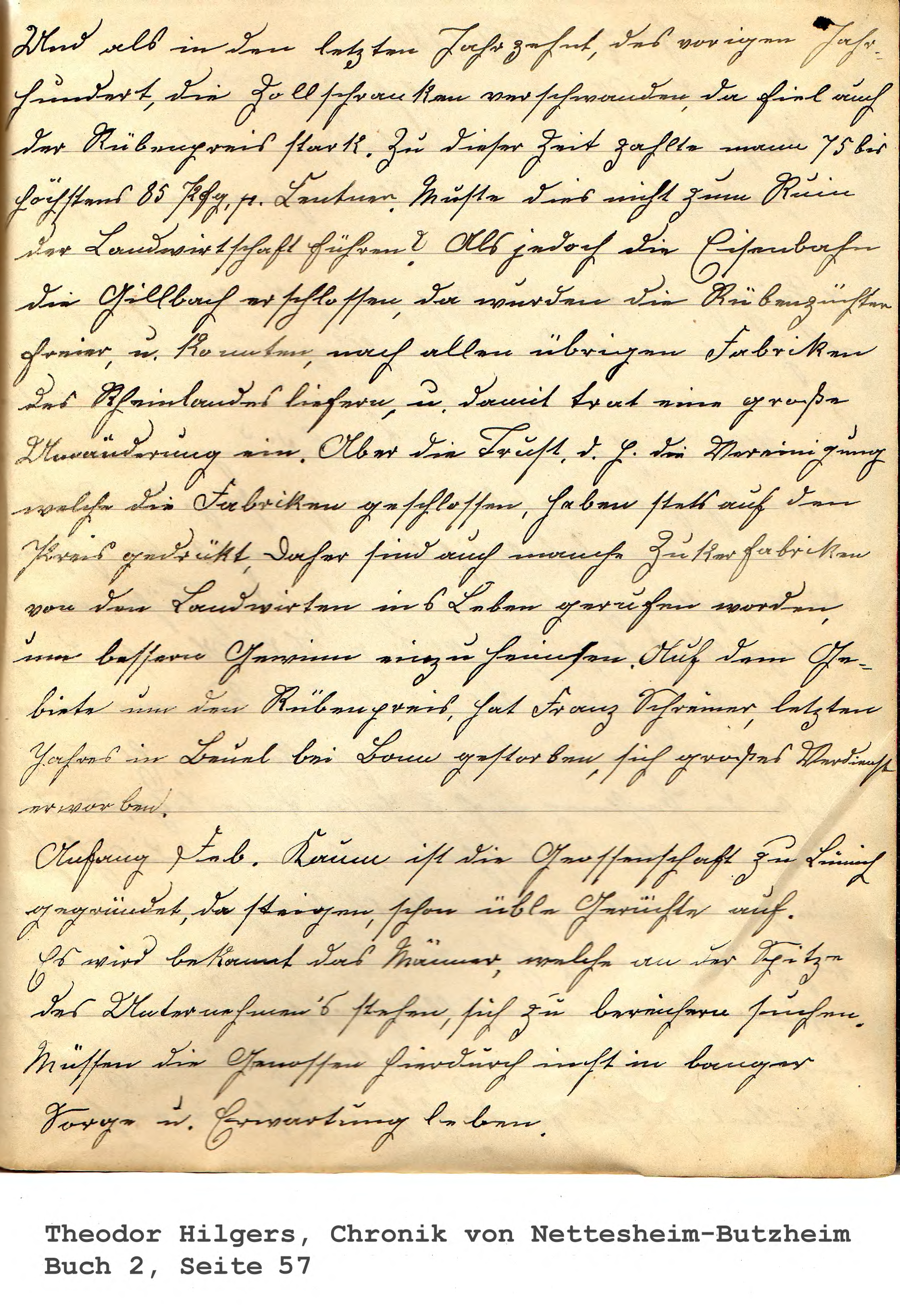 Und als in den letzten Jahrzehnt, des vorigen Jahrhundert, die Zollschranken verschwanden, da fiel auch der Rübenpreis stark. Zu dieser Zeit zahlte mann 75 bis höchstens 85 Pfg, p. Zentner. Muste dies nicht zum Ruin der Landwirtschaft führen? Als jedoch die Eisenbahn die Gillbach erschlossen, da wurden die Rübenzüchter freier, u. konnten, nach allen übrigen Fabriken des Rheinlandes liefern, u. damit trat eine große Veränderung ein. Aber die Trust, d. h. die Vereinigung welche die Fabriken geschlossen, haben stets auf den Preis gedrükt, daher sind auch manche Zukerfabriken von den Landwirten ins Leben gerufen worden, um bessern Gewinn einzuheimsen. Auf dem Gebiete um den Rübenpreis, hat Franz Schreiner, letzten Jahres in Beuel bei Bonn gestorben, sich großes Verdienst erworben. Anfang Feb. Kaum ist die Gnossenschaft zu Linnich gegründet, da steigen, schon üble Gerüchte auf. Es wird bekannt das Männer, welche an der Spitze des Unternehmen´s stehen, sich zu bereichern suchen. Müssen die Genossen hierdurch nicht in banger Sorge u. Erwartung leben.
