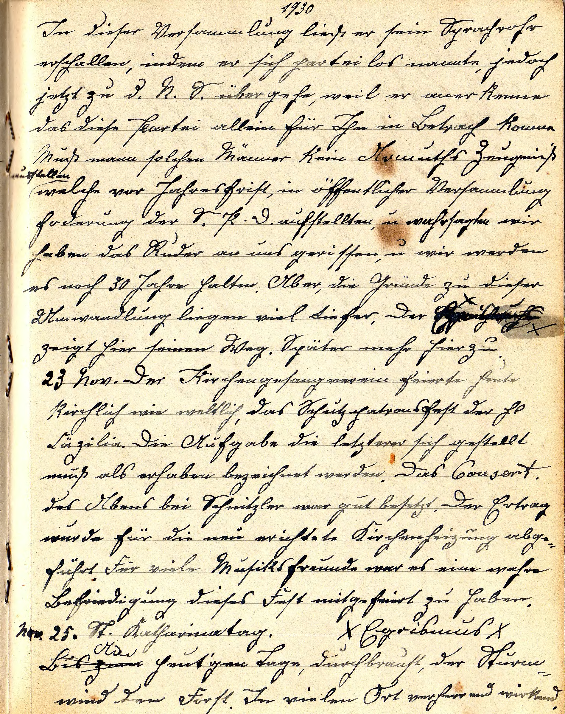 23 Nov. Der Kirchengesangsverein feierte heute kirchlich wie weltlich, das Schutzpatrona(t)sfest der hl. Cäcilia. Die Aufgabe die letztere sich gestellt, muss als erhaben bezeichnet werden. Das Conzert des Aben(d)s bei Schnitzler war gut besetzt. Der Ertrag wurde für die neu er(r)ichtete Kirchenheizung abgeführt. Für viele Musikfreunde war es eine wahre Befriedigung dieses Fest mitgefeiert zu haben.