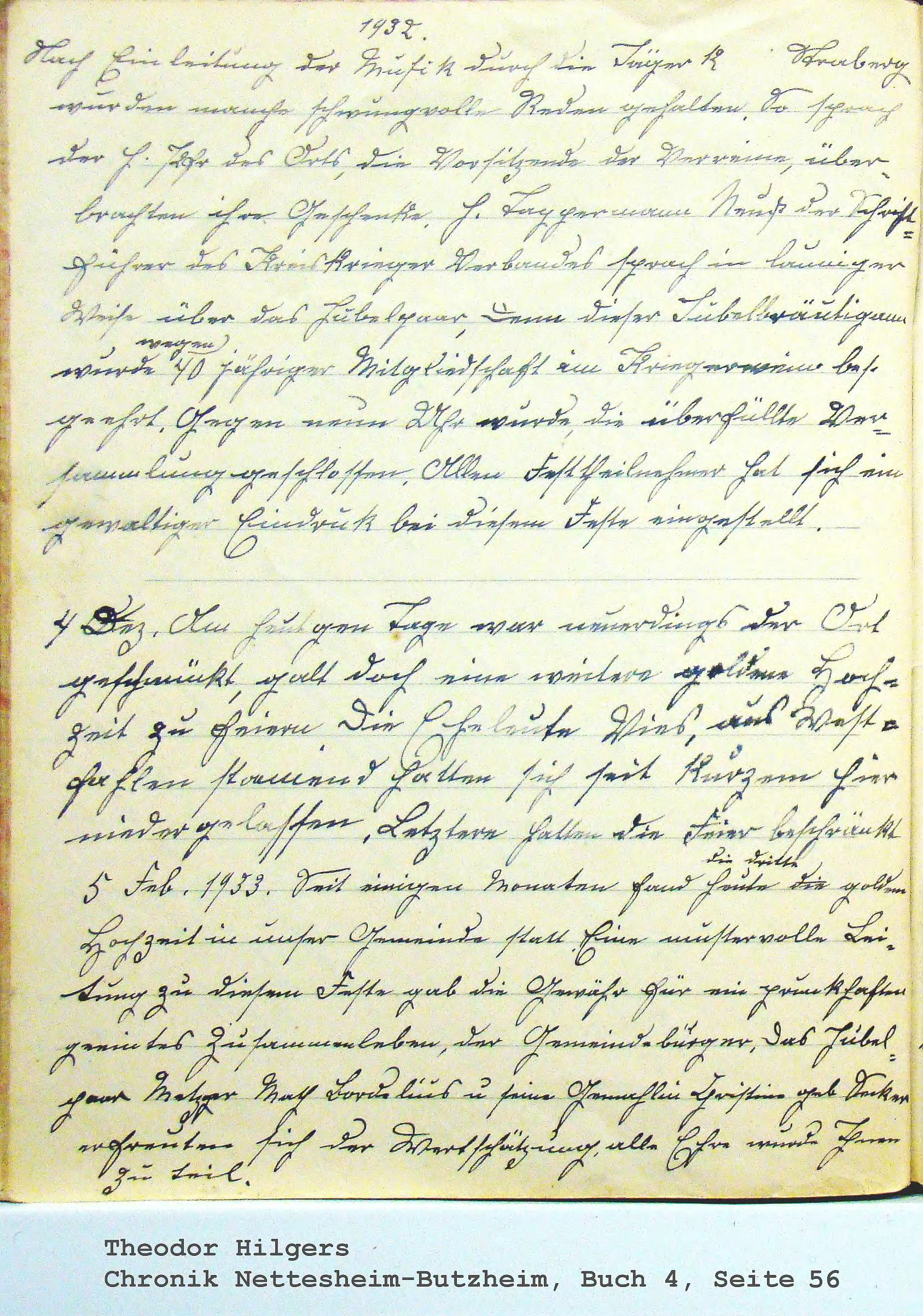 5. Feb. 1933. Seit einigen Monaten fand heute die dritte goldene Hochzeit in unser[er] Gemeinde statt. Eine mustervolle Leitung zu diesen Feste gab die Gewähr für ein prunkhaften geeintes Zusammenleben, der Gemeindebürger, das Jubelpaar Metzger Max Bordelius u. seine Gemahlin Christina geb. Secker erfreuten sich der Wertschätzung, alle Ehre wurde ihnen zu teil.