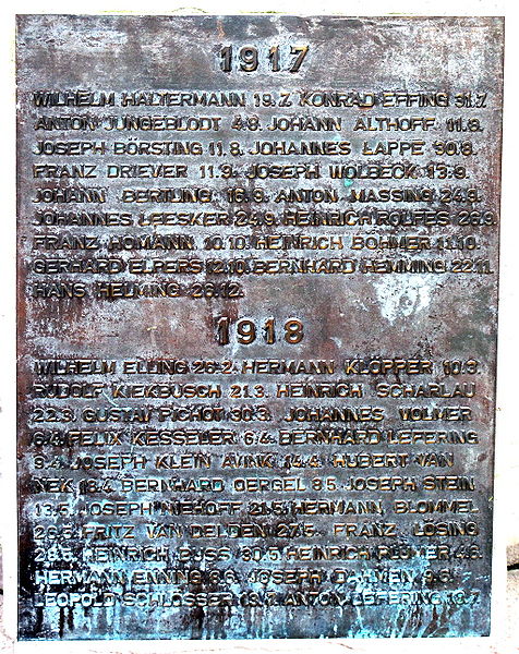| aktuell | 14:43, 28. Mär. 2011 | 1.024 × 1.290 (636 KB) | KlausErdmann (Diskussion • Beiträge) | {{Information |Beschreibung = ;Ehrenmal für die Opfer des I. Weltkrieges in Ahaus: Gedenktafel mit den Namen der Kriegsopfer von 1915, 1916 |Quelle = selbst fotografiert |Urheber = Klaus Erdmann |Datum = 25.03.2011 | |