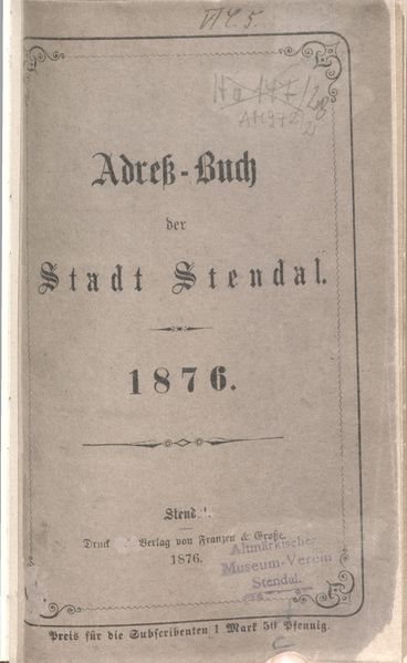 | aktuell | 18:50, 27. Aug. 2021 | 2.500 × 4.070 (983 KB) | PLingnau (Diskussion • Beiträge) | {{Information |Beschreibung = Adressbuch der Stadt Stendal 1876 |Quelle = Scan aus dem Stadtarchiv Stendal |Urheber = PLingnau |Datum = 2021-08-23 |Genehmigung = {{self|Cc-by-nc-sa-3.0-de}} |Andere Versionen = |Anmerkungen = }} [[Cate |