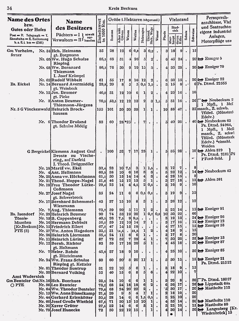 - Beschreibung: Seite 34 von Niekammers´s Landwirtschaftlichem Adreßbuch von 1931, Bandd X. - Provinz Westfalen.
