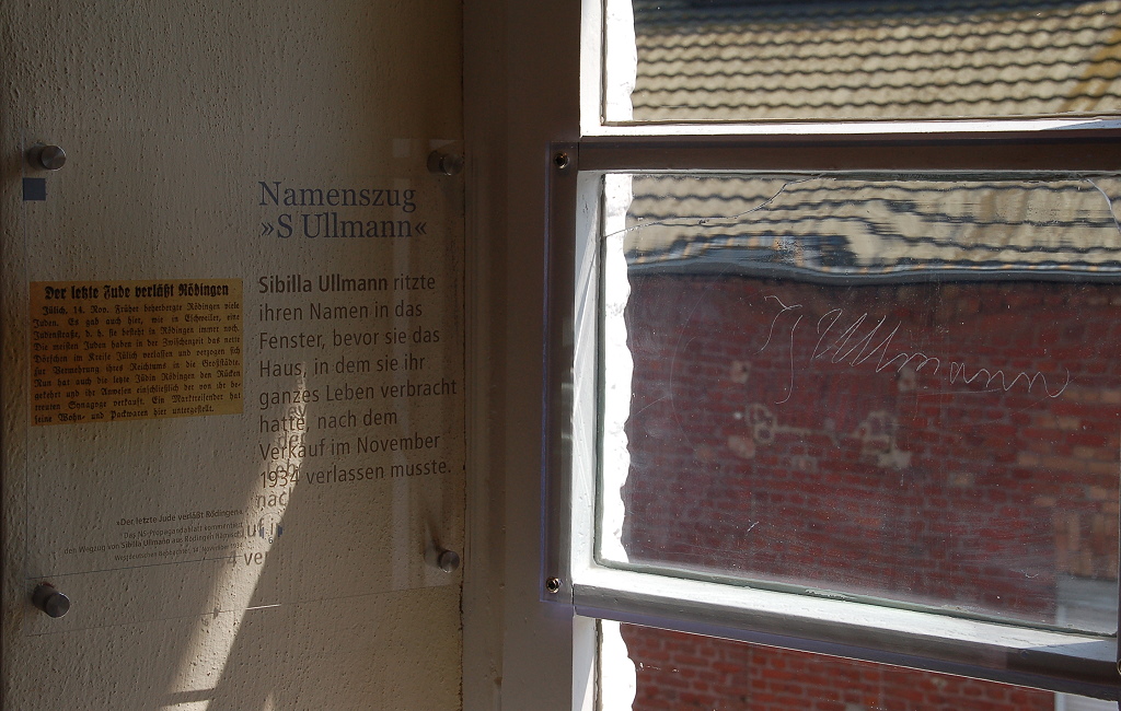 | aktuell | 20:58, 16. Mai 2010 | 1.024 × 650 (350 KB) | KlausErdmann (Diskussion • Beiträge) | {{Information |Beschreibung = Die ehemalige jüdische Synagoge in Rödingen<br />hier der in der Glasscheibe eingeritzte Namenszug von Sibille Ullmann {{Geo|50.965566|6.461216}} |Quelle = selbst fotografiert |Urheber = [[User:KlausErdma |