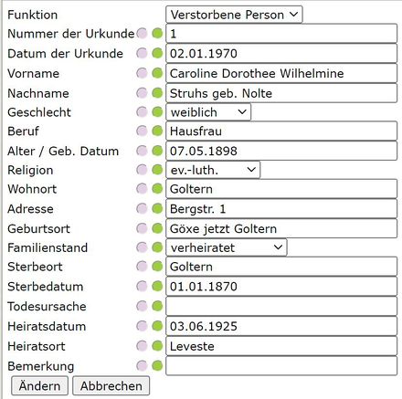 - Verstorbene Person: Hierzu werden die meisten Angaben erfasst. Siehe die nachfolgende Liste.