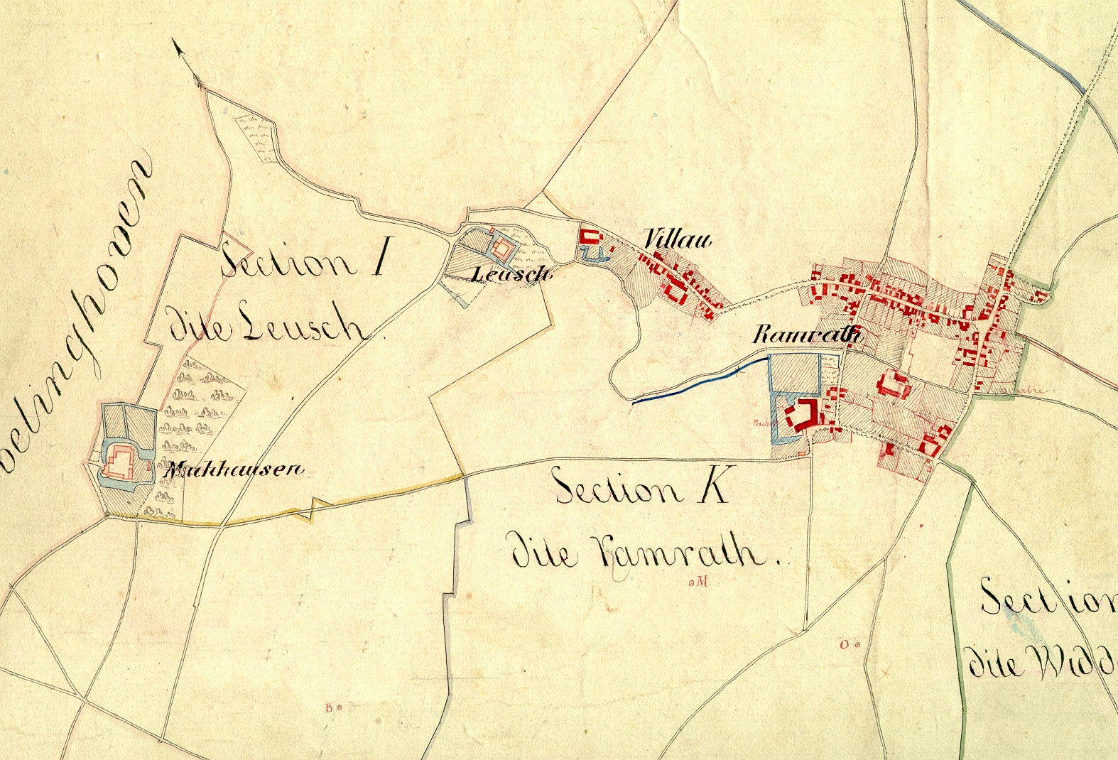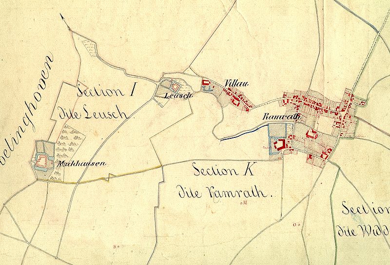 Kartenausschnitt Ramrath von 1810 geografische Lage des Ramrather Hofes: + 51° 5'46.03"N, + 6°40'31.20"O