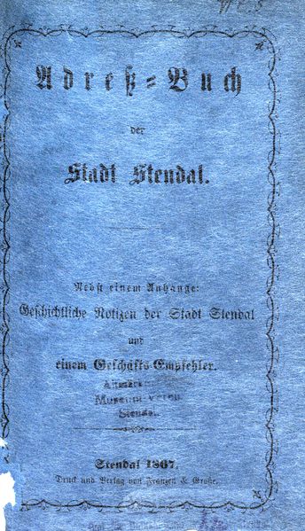 | aktuell | 18:30, 27. Aug. 2021 | 2.307 × 4.014 (1,59 MB) | PLingnau (Diskussion • Beiträge) | {{Information |Beschreibung = Adressbuch der Stadt Stendal 1867 |Quelle = Scan aus dem Stadtarchiv Stendal |Urheber = PLingnau |Datum = 2008-11-28 |Genehmigung = {{self|Cc-by-nc-sa-3.0-de}} |Andere Versionen = |Anmerkungen = }} [[Cate |