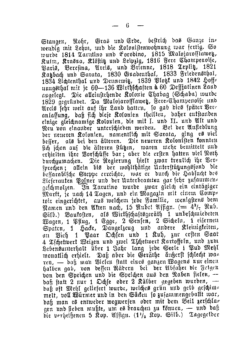 Stangen, Rohr, Gras und Erde, bestrich das Ganze inwendig mit Lehm, und die Kolonistenwohnung war fertig. So wurde 1814 Tarutiono und Borodino, 1815 Malojaroslawetz, Kulm, Krasna, Klöstitz und Leipzig, 1816 Fere Champenoise, Paris, Beresina, Arcis und Brienne, 1818 Teplitz, 1821 Katzbach und Sarata, 1830 Gnadenthal, 1833 Friedensthal, 1834 Lichtenthal und Dennewitz, 1839 Plozk und 1842 Hoffnungsthal mit je 60-136 Wirthschaften à 60 Dessiatinen Land angelegt. Die alleinstehende Kolonie Chabag (Schaba) wurde 1829 gegründet. Da Malojaroslawetz, Fere Champenoise und Arcis sehr weit auf ihr Land hatten, so gab dies später Veranlassung, daß sich diese Kolonien theilten, daher entstanden einige gleichnamige Kolonien, die mit I. und II. und Alt und Neu von einander unterschieden werden. Bei der Ansiedlung der neueren Kolonien, namentlich mit Sarata, ging es viel besser, als bei den älteren. Die neueren Kolonisten konnten sich schon auf die älteren stützen, waren mehr bemittelt und erhielten ihre Vorschüsse bar; aber die ersten hatten viel Noth durchzumachen. Die Regierung hielt zwar treulich ihr Versprechen; allein bis der wohlthätige Unterstützungsfond die bessarabische Steppe erreichte, war er durch die Habsucht des Lieferanten Polner und der Unterbeamten gar sehr zusammengeschmolzen. In Tarutino wurde zwar gleich ein eintägiger Markt, je nach 14 Tagen, und ein Magazin mit einem Comptoir eingerichtet, aus welchem jede Familie, wenigstens dem Namen und den Akten nach, 15 Rubel