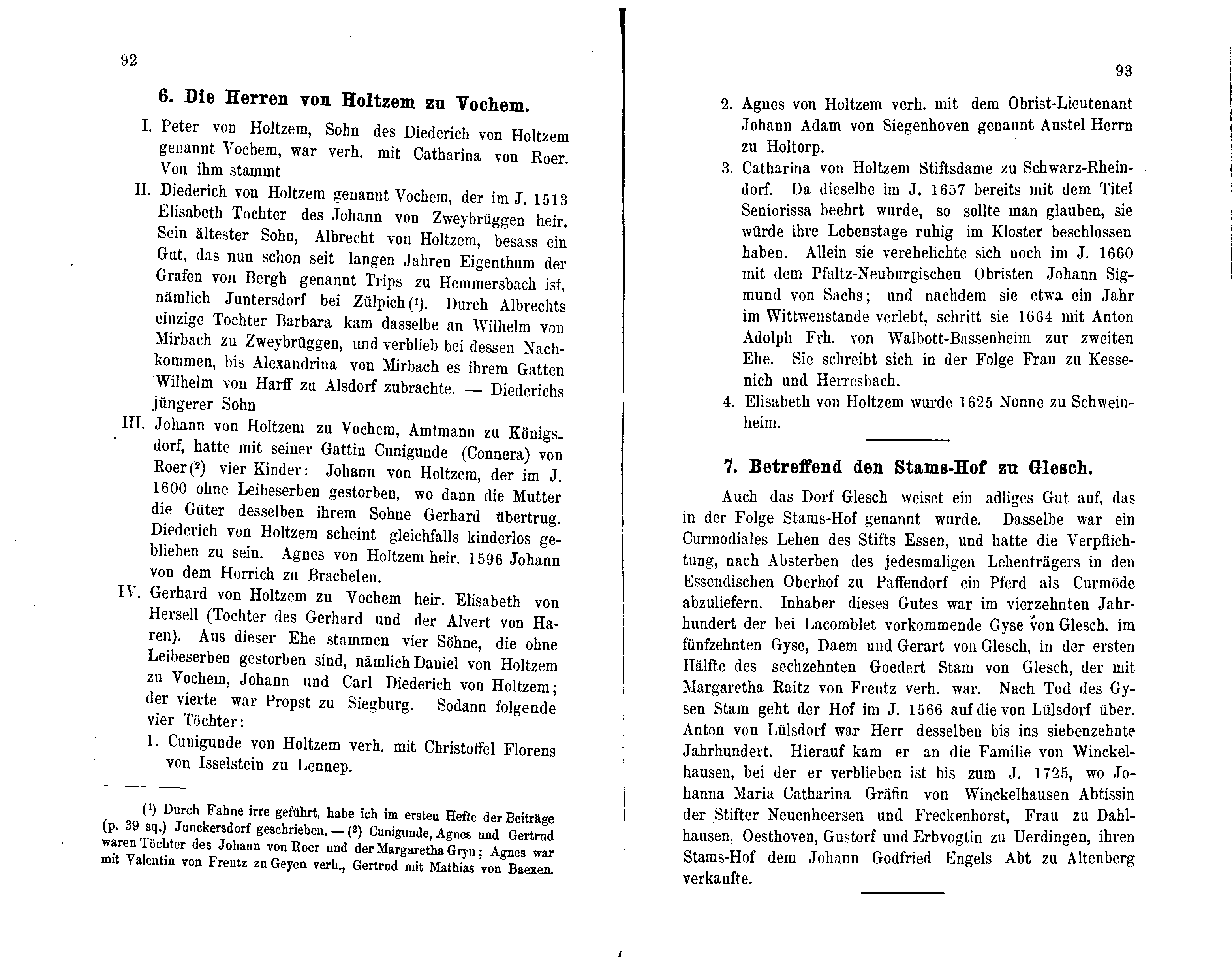 - II. Diederich von Holtzem genannt Vochem, der im J. 1513 Elisabeth Tochter des Johann von Zweybrüggen heir. Sein ältester Sohn, Albrecht von Holtzem, besass ein Gut, das nun schon seit langen Jahren Eigenthum der Grafen von Bergh genannt Trips zu Hemmersbach ist. nämlich Juntersdorf bei Zülpich(1). Durch Albrechts einzige Tochter Barbara kam dasselbe an Wilhelm von Mirbach zu Zweybrüggen, und verblieb bei dessen Nachkommen, bis Alexandrina von Mirbach es ihrem Gatten Wilhelm von Harff zu Alsdorf zubrachte. — Diederichs jüngerer Sohn