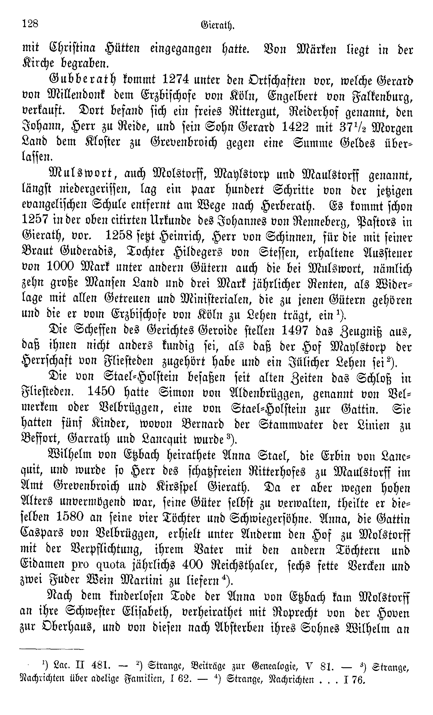 Wilhelm von Etzbach heirathtete Anna Stael, die Erbin von Lancquit, und wurde so Herr des schatzfreien Ritterhofes zu Maulstorff im Amt Grevenbroich und Kirspel Gierath. Da er aber wegen hohen Alters unvermögend war, seine Güter selbst zu verwalten, theilte er dieselben 1580 an seine vier Töchter und Schwiegersöhne. Anna, die Gattin Caspars von Velbrüggen, erhielt unter Anderm den Hof zu Molstorff mit der Verpfichtung, ihrem Vater mit den andern Töchtern und Eidamen pro quota jährlichs 400 Reichthaler, sechs fette Vercken und zwei Fuder Wein Martini zu liefern[4].