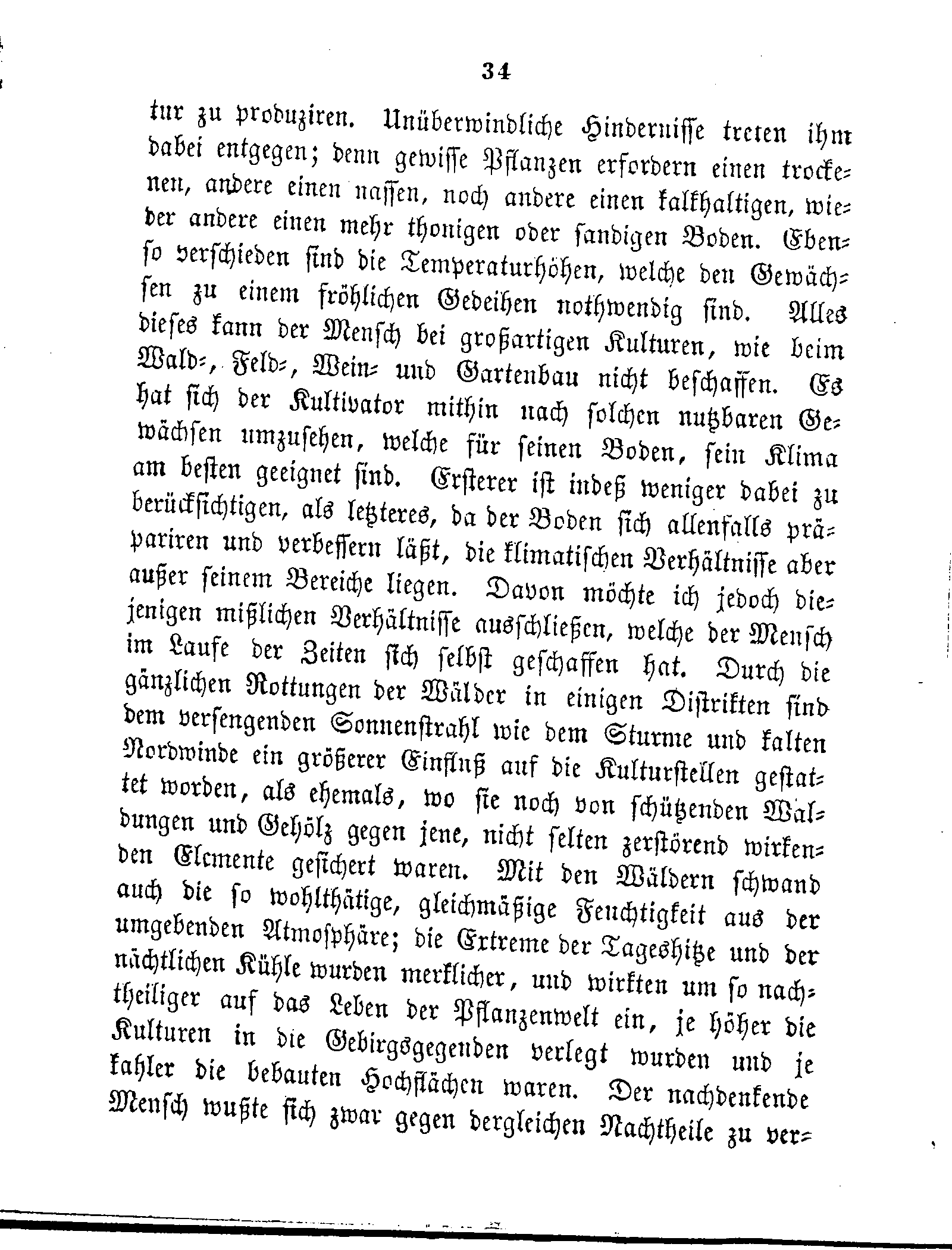 zu produziren. Unüberwindliche Hindernisse treten ihm dabei entgegen; denn gewisse Pflanzen erfordern einen trockenen, andere einen nassen, noch andere einen kalkhaltigen, wieder andere einen mehr thonigen oder sandigen Boden. Ebenso verschieden sind die Temperaturhöhen, welche den Gewächsen zu einem fröhlichen Gedeihen nothwendig sind. Alles dieses kann der Mensch bei großartigen Kulturen, wie beim Wald-, Feld-, Wein- und Gartenbau nicht beschaffen. Es hat sich der Kultivator mithin nach solchen nutzbaren Gewächsen umzusehen, welche für seinen Boden, sein Klima am besten geeignet sind. Ersterer ist indeß weniger dabei zu berücksichtigen, als letzteres, da der Boden sich allenfalls präpariren und verbessern läßt, die klimatischen Verhältnisse aber außer seinem Bereiche liegen. Davon möchte ich jedoch diejenigen mißlichen Verhältnisse ausschließen, welche der Mensch im Laufe der Zeiten sich selbst geschaffen hat. Durch die gänzlichen Rottungen der Wälder in einigen Distrikten sind dem versengenden Sonnenstrahl wie dem Sturme und kalten Nordwinde ein größerer Einfluß auf die Kulturstellen gestattet worden, als ehemals, wo sie noch von schützenden Waldungen und Gehölz gegen jene, nicht selten zerstörend wirkenden Elemente gesichert waren. Mit den Wäldern schwand auch die so wohlthätige, gleichmäßige Feuchtigkeit aus der umgebenden Atmosphäre; die Extreme der Tageshitze und der nächtlichen Kühle wurden merklicher, und wirkten um so nachtheiliger auf das Leben der Pflanzenwelt ein, je höher die Kulturen in die Gebirgsgegenden verlegt wurden und je kahler die bebauten Hochflächen waren. Der nachdenkende Mensch wußte sich zwar gegen dergleichen Nachtheile zu verwahren