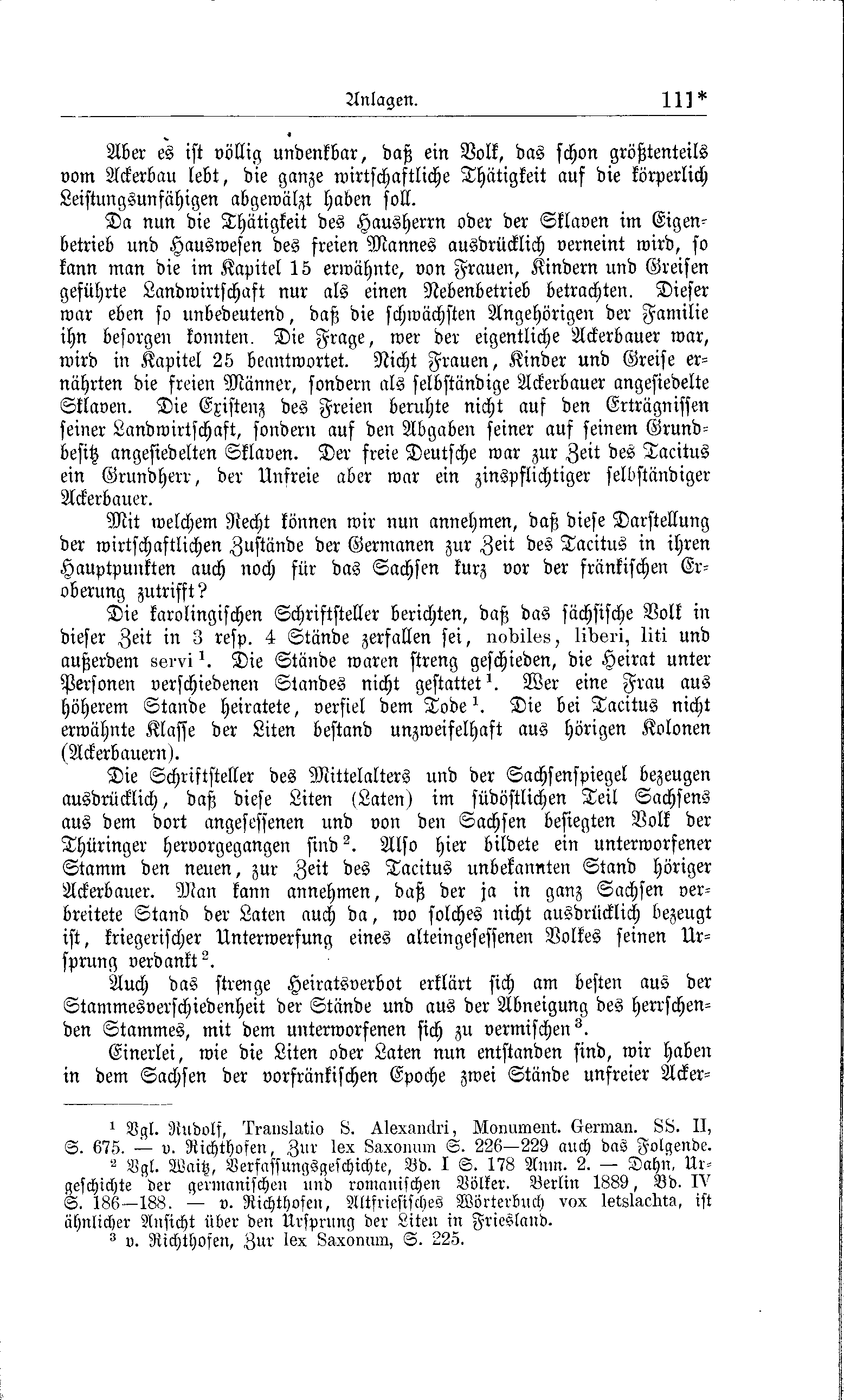 Die Schriftsteller des Mittelalters und der Sachsenspiegel bezeugen ausdrücklich, daß diese Liten <Laten) im südöstlichen Teil Sachsens aus dem dort angesessenen und von den Sachsen besiegten Volk der Thüringer hervorgegangen sind^. Also hier bildete ein unterworfener Stamm den neuen, zur Zeit des Tacitus unbekannten Stand höriger Ackerbauer. Man kann annehmen, daß der ja in ganz Sachsen verbreitete Stand der Laien auch da, wo solches nicht ausdrücklich bezeugt ist, kriegerischer Unterwerfung eines alteingesessenen Volkes seinen Ursprung verdankt 2.