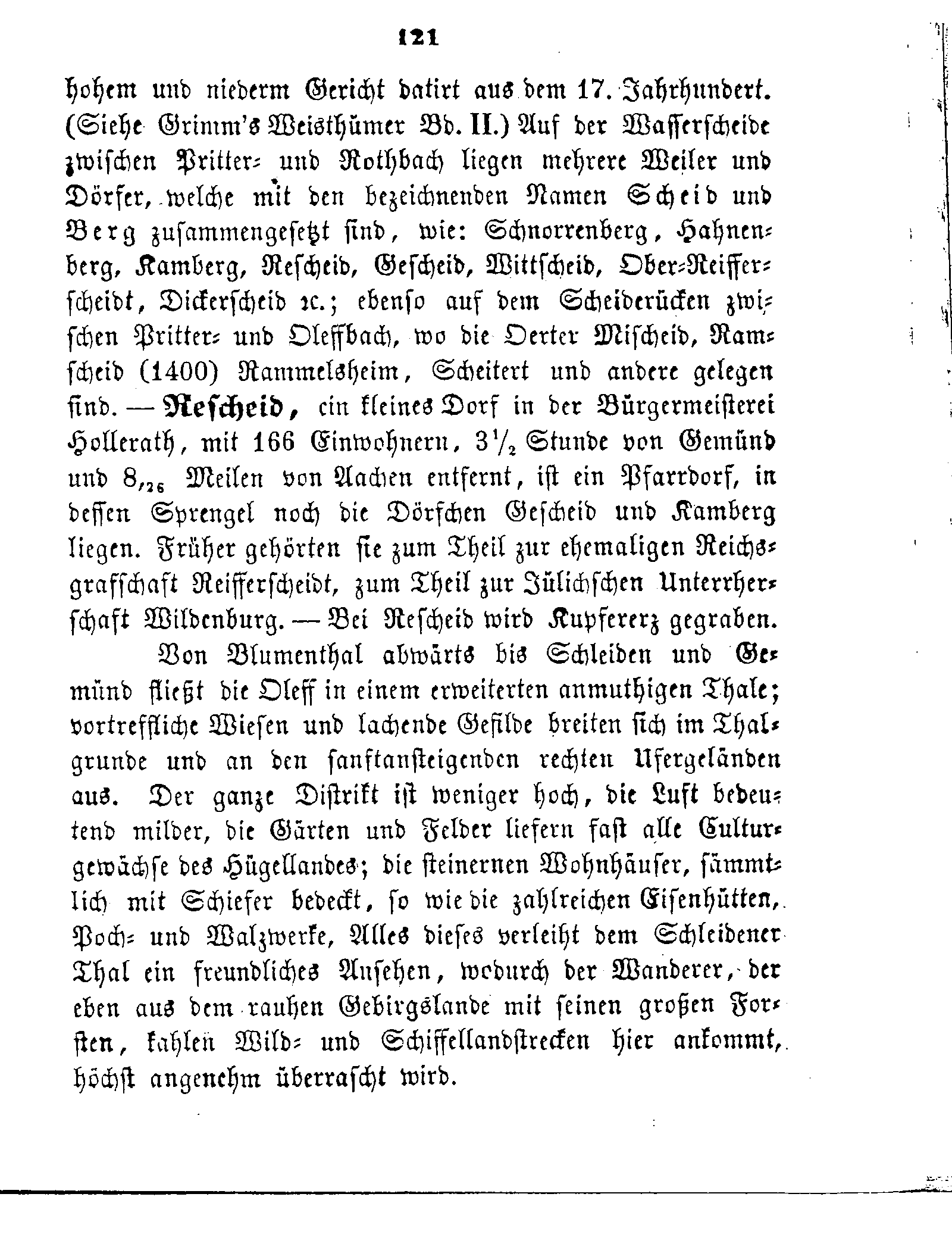 hohem und niedern Gericht datirt aus dem 17. Jahrhundert. (Siehe Grimm's Weisthümer Bd. II.) Auf der Wasserscheide zwischen Pritter- und Rothbach liegen mehrere Weiler und Dörfer, welche mit den bezeichnenden Namen Scheid und Berg zusammengesetzt sind, wie: Schnorrenberg, Hahnenberg, Kamberg, Rescheid, Gescheid, Wittscheid, Ober-Reifferscheidt, Dickerscheid ec.; ebenso auf dem Scheiderücken zwischen Pritter- und Oleffbach, wo die Oerter Mischeid, Ramscheid (1400) Rammelsheim, Scheitert und andere gelegen sind. — Rescheid, ein kleines Dorf in der Bürgermeisterei Hollerath, mit 166 Einwohnern. 3½ Stunde von Gemünd und 8,26 Meilen von Aachen entfernt, ist ein Pfarrdorf, in dessen Sprengel noch die Dörfchen Gescheid und Kamberg liegen. Früher gehörten sie zum Theil zur ehemaligen Reichsgrafschaft Reifferscheidt, zum Theil zur Jülichschen Unterrherschaft Wildenburg. — Bei Rescheid wird Kupfererz gegraben.