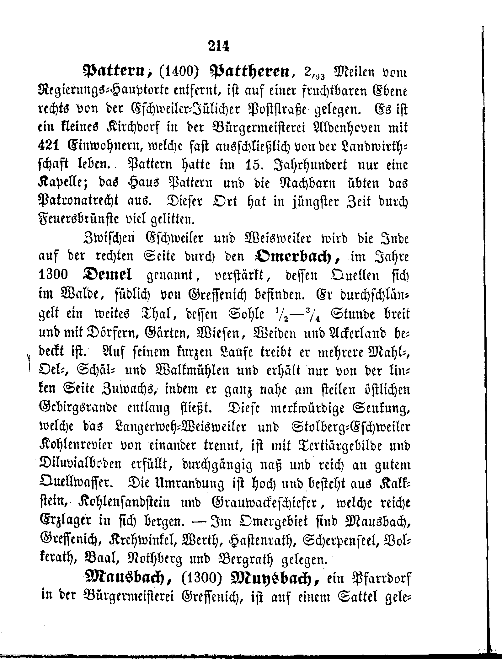 Zwischen Eschweiler und Weisweiler wird die Inde auf der rechten Seite durch den Omerbach, im Jahre 1300 Demel genannt, verstärkt, dessen Quellen sich im Walde, südlich von Gressenich befinden. Er durchschlängelt ein weites Thal, dessen Sohle ½-¾ Stunde breit und mit Dörfern, Gärten, Wiesen, Weiden und Ackerland bedeckt ist. Auf seinem kurzen Laufe treibt er mehrere Mahl-, Oel-, Schäl- und Walkmühlen und erhält nur von der linken Seite Zuwachs, indem er ganz nahe am steilen östlichen Gebirgsrande entlang fließt. Diese merkwürdige Senkung, welche das Langerweh-Weisweiler und Stolberg-Eschweiler Kohlenrevier von einander trennt, ist mit Tertiärgebilde und Diluvialboden erfüllt, durchgängig naß und reich an gutem Quellwasssr. Die Umrandung ist hoch und besteht aus Kalkstein, Kohlensandstein und Grauwackeschiefer, welche reiche Erzlager in sich bergen. — Im Obergebiet sind Mausbach, Gressenich, Krehwinkel, Werth, Hastenrath, Scherpenseel, Volkerath, Baal, Nothberg und Bergrath gelegen.