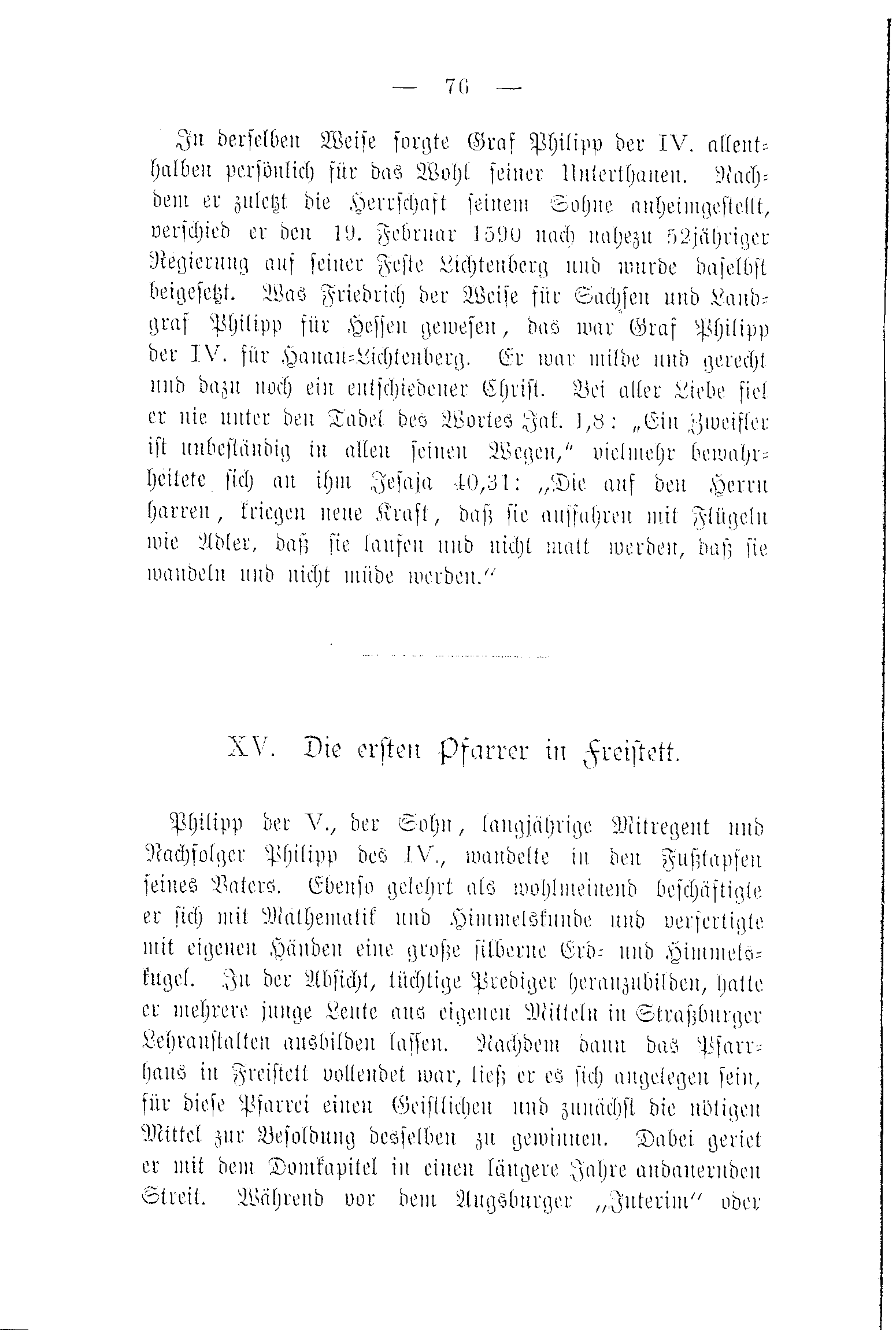 In derselben Weise sorgte Graf Philipp der IV. allenthalben persönlich für das Wohl seiner Unterthanen. Nachdem er zuletzt die Herrschaft seinem Sohne anheimgestellt, verschied er den 19. Februar 1590 nach nahezu 52jähriger Regierung auf seiner Feste Lichtenberg und wurde daselbst beigesetzt. Was Friedrich der Weise für Sachsen und Landgraf Philipp für Hessen gewesen, das war Graf Philipp der IV. für Hanau-Lichtenberg. Er war milde und gerecht und dazu noch ein entschiedener Christ. Bei aller Liebe fiel er nie unter den Tadel des Wortes Jak. 1,8: Ein Zweifler ist unbeständig in allen seinen Wegen, vielmehr bewahrheitete sich an ihm Jesaja 40,31: ,,Die auf den Herrn harren, kriegen neue Kraft, daß sie ausfahren mit Flügeln wie Adler, daß sie laufen und nicht matt werden, daß sie wandeln und nicht müde werden.