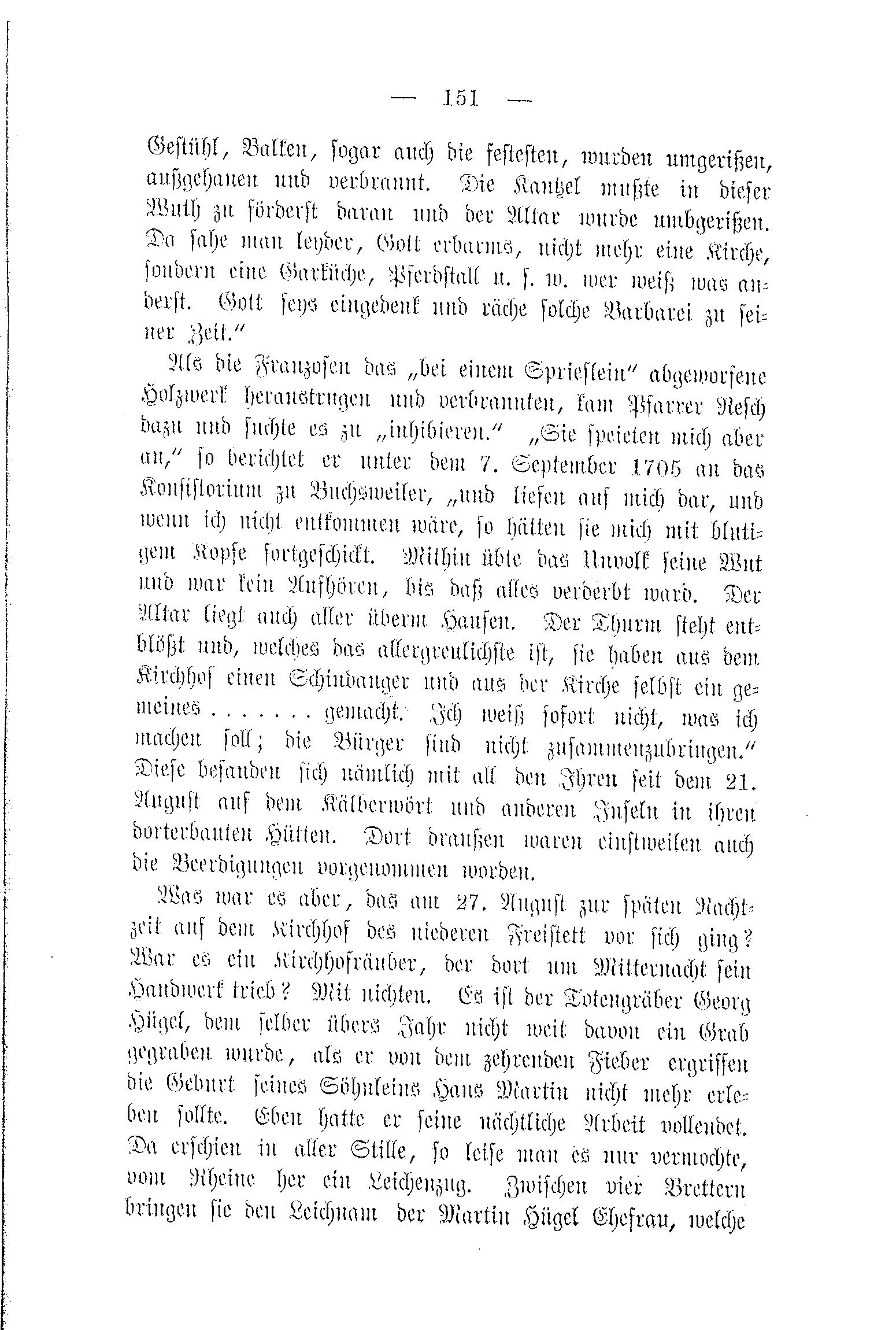 Als die Franzosen das „bei einem Sprieslein" abgeworfene Holzwerk heranstrugen und verbrannten, kam Pfarrer Resch dazu und suchte es zu „inhibieren." „Sie speieten mich aber an," so berichtet er unter dem 7. September 1705 an das Konsistorium zu Buchsweiler, „und liefen auf mich dar, und wenn ich nicht entkommen wäre, so hätten sie mich mit blutigem Kopfe fortgeschickt. Mithin übte das Unvolk seine Wut und war kein Aufhören, bis daß alles verderbt ward. Der Altar liegt auch aller überm Haufen. Der Thurm steht entblößt und, welches das allergreulichste ist, sie haben aus dem Kirchhof einen Schindanger und aus der Kirche selbst ein gemeines ....... gemacht. Ich weiß sofort nicht, was ich machen soll; die Bürger sind nicht zusammenzubringen.“ Diese befanden sich nämlich mit all den Ihren seit dem 21. August aus dem Kälberwört und anderen Inseln in ihren dorterbauten Hütten. Dort draußen waren einstweilen auch die Beerdigungen vorgekommen worden.