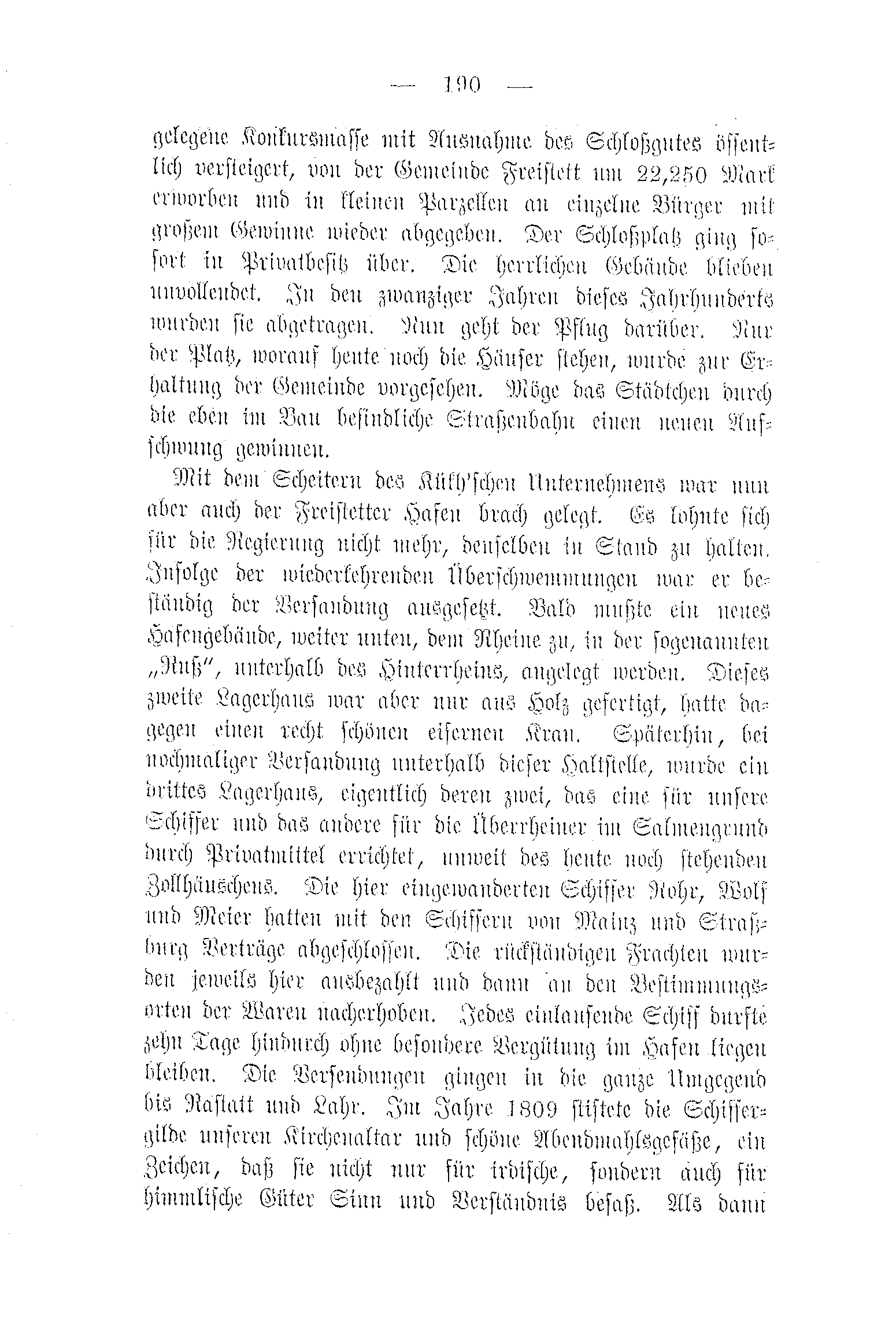 gelegene Konkursmasse mit Ausnahme des Schloßgutes öffentlich versteigert, von der Gemeinde Freistett um 22,250 Mark erworben und in kleinen Parzellen an einzelne Bürger mit großen Gewinne wieder abgegeben. Der Schloßplatz ging sofort in Privatbesitz über. Die herrlichen Gebäude blieben unvollendet. In den zwanziger Jahren dieses Jahrhunderts wurden sie abgetragen. Nun geht der Pflug darüber. Nur der Platz, woranf heute noch die Hänser stehen, wurde zur Erhaltung der Gemeinde vorgesehen. Möge das Städtchen durch die eben im Bau befindliche Straßenbahn einen neuen Aufschwung gewinnen.