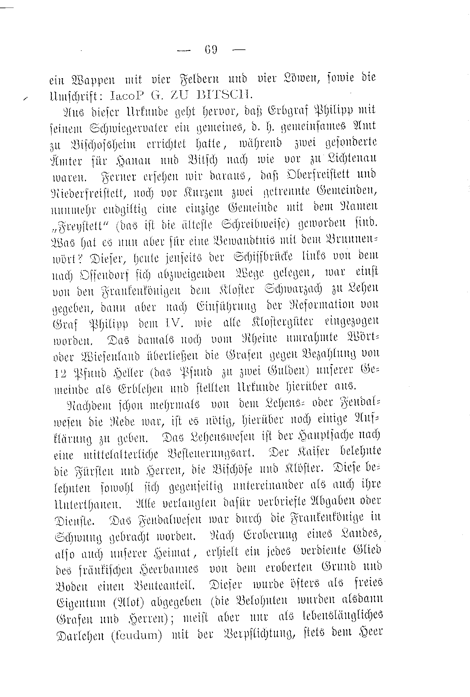 Nachdem schon mehrmals von dem Lehens- oder Feudalwesen die Rede war, ist es nötig, hierüber noch einige Aufklärung zu geben. Das Lehenswesen ist der Hauptsache nach eine mittelalterliche Besteuerungsart. Der Kaiser belehnte die Fürsten und Herren, die Bischöfe und Klöster. Diese belehnten sowohl sich gegenseitig untereinander als auch ihre Unterthanen. Alle verlangten dafür verbriefte Abgaben oder Dienste. Das Feudalwesen war durch die Frankenkönige in Schwung gebracht worden. Nach Eroberung eines Landes, also auch unserer Heimat, erhielt ein jedes verdiente Glied des fränkischen Heerbannes von dem eroberten Grund und Boden einen Beuteanteil. Dieser wurde öfters als freies Eigentum (Alot) abgegeben (die Belohnten wurden alsdann Grafen und Herren); meist aber nur als lebenslängliches Darlehen (feudum) mit der Verpflichtung, stets dem Heer