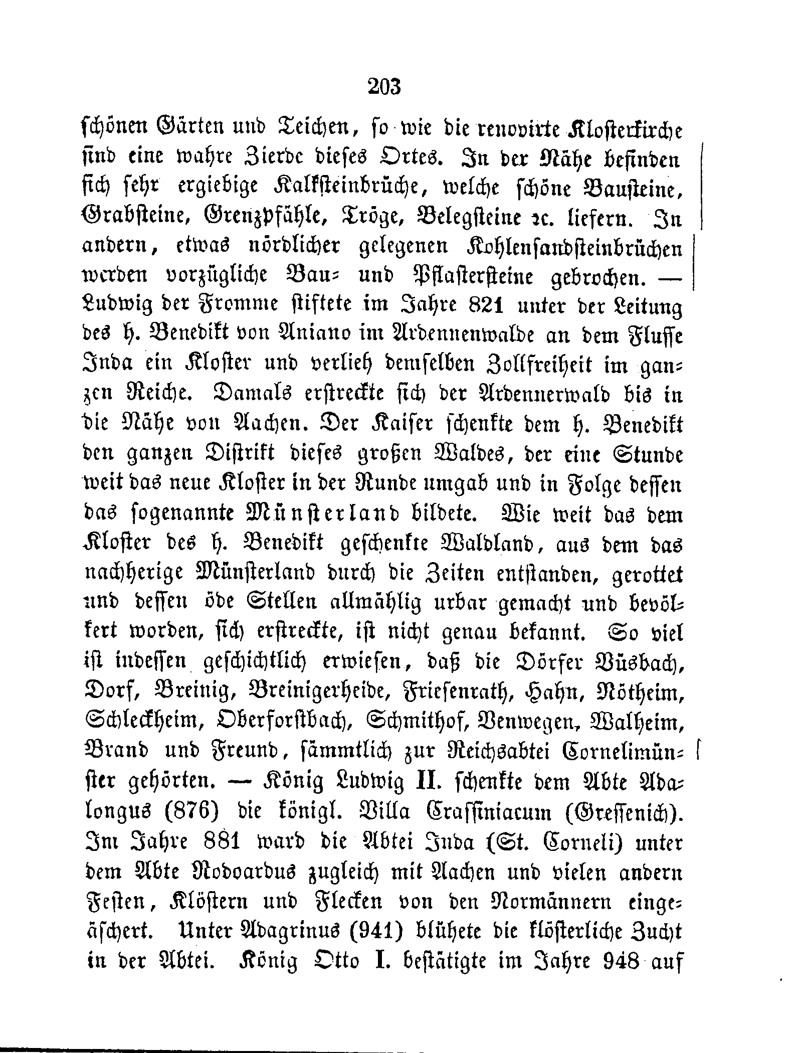 schönen Gärten und Teichen, so wie die renovirte Klosterkirche sind eine wahre Zierde dieses Ortes. In der Nähe befinden sich sehr ergiebige Kalksteinbrüche, welche schöne Bausteine, Grabsteine, Grenzpfähle, Tröge, Belegsteine ec. liefern. In andern, etwas nördlicher gelegenen Kohlensandsteinbrüchen werden vorzügliche Bau- und Pflastersteine gebrochen. — Ludwig der Fromme stiftete im Jahre 821 unter der Leitung des h. Benedikt von Aniano im Ardennenwalde an dem Flusse Inda ein Kloster und verlieh demselben Zollfreiheit im ganzen Reiche. Damals erstreckte sich der Ardennerwald bis in die Nähe von Aachen. Der Kaiser schenkte dem h. Benedikt den ganzen Distrikt dieses großen Waldes, der eine Stunde weit das neue Kloster in der Runde umgab und in Folge dessen das sogenannte Münsterland bildete. Wie weit das dem Kloster des h. Benedikt geschenkte Waldland, aus dem das nachherige Münsterland durch die Zeiten entstanden, gerottet und dessen öde Stellen allmählig urbar gemacht und bevölkert worden, sich erstreckte, ist nicht genau bekannt. So viel ist indessen geschichtlich erwiesen, daß die Dörfer Büsbach, Dorf, Breinig, Breinigerheide, Friesenrath, Hahn, Nötheim, Schleckheim, Oberforstbach, Schmithof, Venwegen, Walheim, Brand und Freund, sämmtlich zur Reichsabtei Cornelimünster gehörten. — König Ludwig II. schenkte dem Abte Adalongus (876) die königl. Villa Crassiniacum (Gressenich). Im Jahre 881 ward die Abtei Inda (St. Corneli) unter dem Abte Rodoardus zugleich mit Aachen und vielen andern Festen, Klöstern und Flecken von den Normännern eingeäschert. Unter Adagrinus (941) blühete die klösterliche Zucht in der Abtei. König Otto I. bestätigte im Jahre 948 auf
