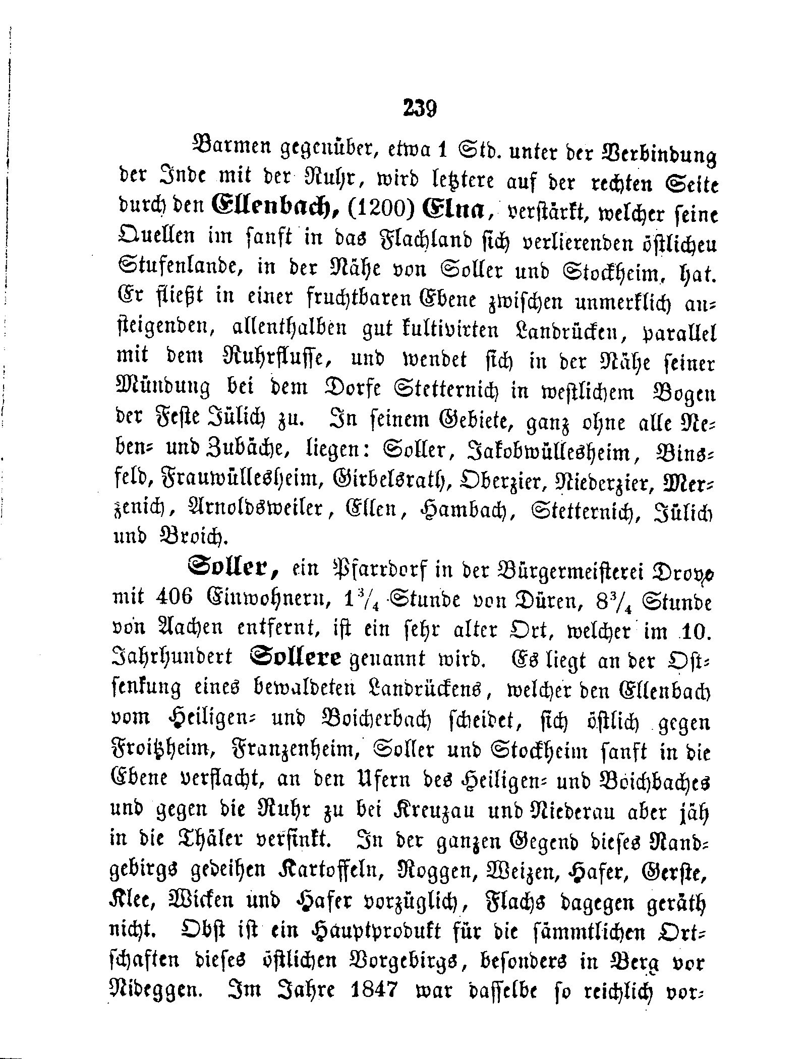 Barmen gegenüber, etwa 1 Std. unter der Verbindung der Inde mit der Ruhr, wird letztere auf der rechten Seite durch den Ellenbach, (1200) Elna verstärkt, welcher seine Quellen im sanft in das Flachland sich verlierenden östlichen Stufenlande, in der Nähe von Soller und Stockheim, hat. Er fließt in einer fruchtbaren Ebene zwischen unmerklich ansteigenden, allenthalben gut kultivirten Landrücken, parallel mit dem Ruhrflusse, und wendet sich in der Nähe seiner Mündung bei dem Dorfe Stetternich in westlichem Bogen der Feste Jülich zu. In seinem Gebiete, ganz ohne alle Neben- und Zubäche, liegen: Soller, Jakobwüllesheim, Binsfeld, Frauwüllesheim, Girbelsrath, Oberzier, Niederzier, Merzenich, Arnoldsweiler, Ellen, Hambach, Stetternich, Jülich und Broich.