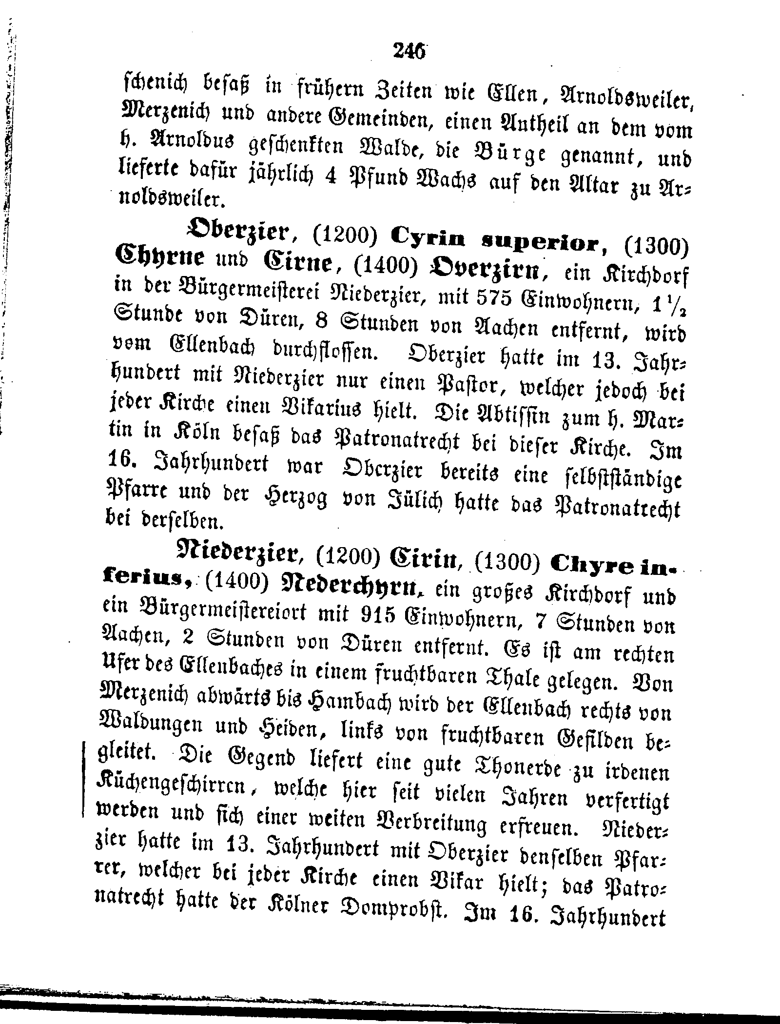 Oberzier, (1200) Cyrin superior, (1300) Chyrne und Cirne, (1400) Overzirn, ein Kirchdorf in der Bürgermeisterei Niederzier, mit 575 Einwohnern, l½ Stunde von Düren, 8 Stunden von Aachen entfernt, wird vom Ellenbach durchflossen. Oberzier hatte im 13. Jahrhundert mit Niederzier nur einen Pastor, welcher jedoch bei jeder Kirche einen Vikarius hielt. Die Abtissin zum h. Martin in Köln besaß das Patronatrecht bei dieser Kirche. Im 16. Jahrhundert war Oberzier bereits eine selbstständige Pfarre und der Herzog von Jülich hatte das Patronatrecht bei derselben.
