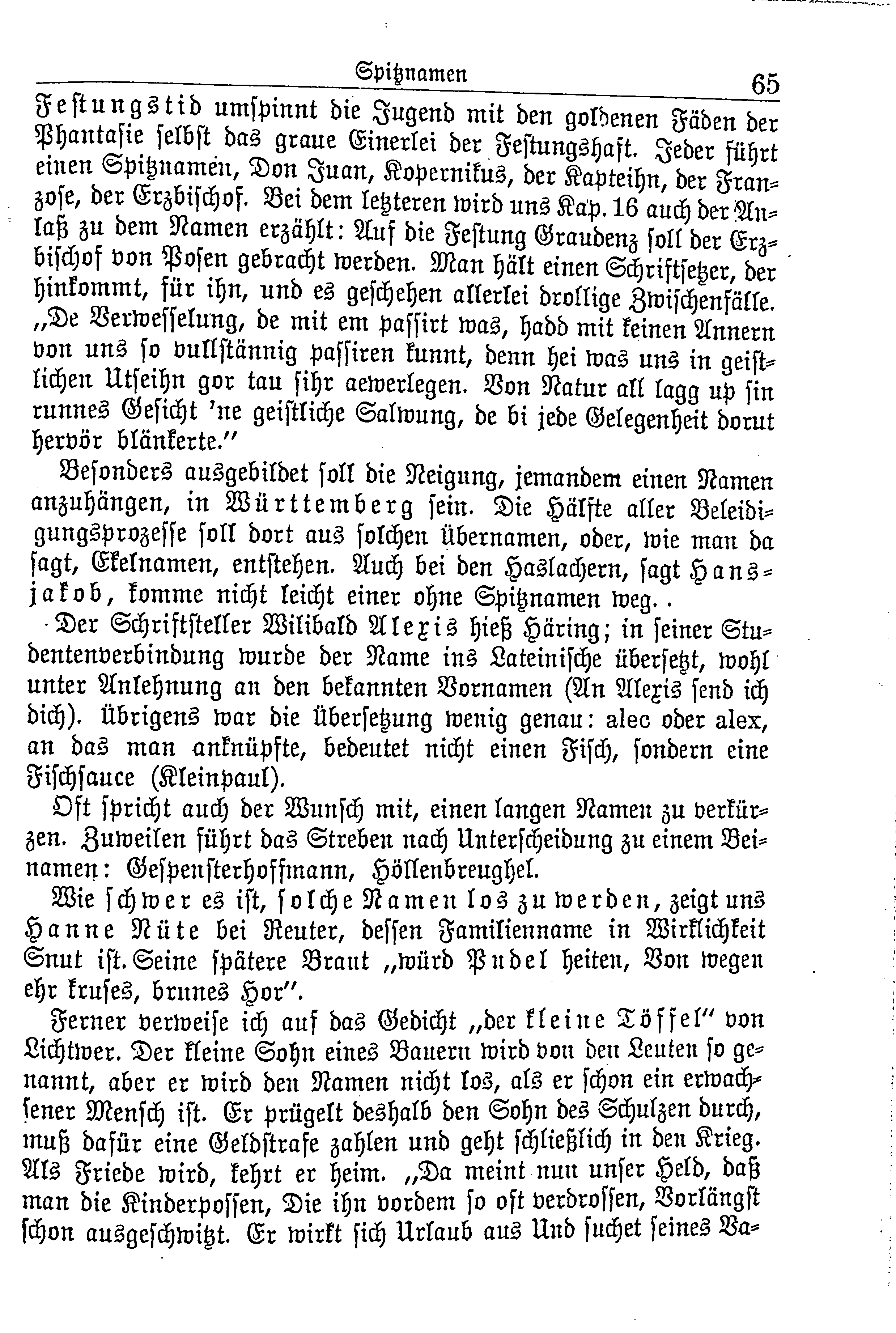 Besonders ausgebildet soll die Neigung, jemandem einen Namen anzuhängen, in Württemberg sein. Die Hälfte aller Beleidigungsprozesse soll dort aus solchen Übernamen, oder, wie man da sagt, Ekelnamen, entstehen. Auch bei den Haslachern, sagt Hansjakob, komme nicht leicht einer ohne Spitznamen weg.