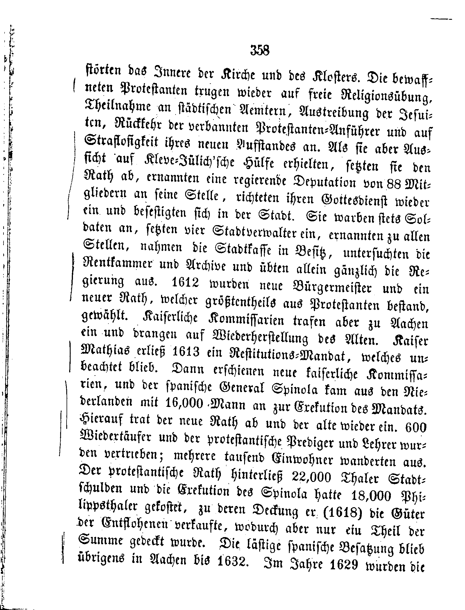 das Innere der Kirche und des Klosters. Die bewaffneten Protestanten trugen wieder auf freie Religionsübung, Theilnahme an städtischen Aemtern, Austreibung der Jesuiten, Rückkehr der verbannten Protestanten-Anführer und auf Straflosigkeit ihres neuen Aufstandes an. Als sie aber Aussicht auf Kleve-Jülich'sche Hülfe erhielten, setzten sie den Rath ab, ernannten eine regierende Deputation von 88 Mitgliedern an seine Stelle, richteten ihren Gottesdienst wieder ein und befestigten sich in der Stadt. Sie warben stets Soldaten an, setzten vier Stadtverwalter ein, ernannten zu allen Stellen, nahmen die Stadtkasse in Besitz, untersuchten die Rentkammer und Archive und übten allein gänzlich die Regierung aus. 1612 wurden neue Bürgermeister und ein neuer Rath, welcher größtentheils aus Protestanten bestand, gewählt. Kaiserliche Kommissarien trafen aber zu Aachen ein und drangen auf Wiederherstellung des Alten. Kaiser Mathias erließ 1613 ein Restitutions-Mandat, welches unbeachtet blieb. Dann erschienen neue kaiserliche Kommissarien, und der spanische General Spinola kam aus den Niederlanden mit 16,000 Mann an zur Exekution des Mandats. Hierauf trat der neue Rath ab und der alte wieder ein. 600 Wiedertäufer und der protestantische Prediger und Lehrer wurden vertrieben; mehrere tausend Einwohner wanderten aus. Der protestantische Rath hinterließ 22,000 Thaler Stadtschulden und die Exekution des Spinola hatte 18,000 Philippsthaler gekostet, zu deren Deckung er (1618) die Güter der Entflohenen verkaufte, wodurch aber nur ein Theil der Summe gedeckt wurde. Die lästige spanische Besatzung blieb übrigens in Aachen bis 1632. Im Jahre 1629 wurden die
