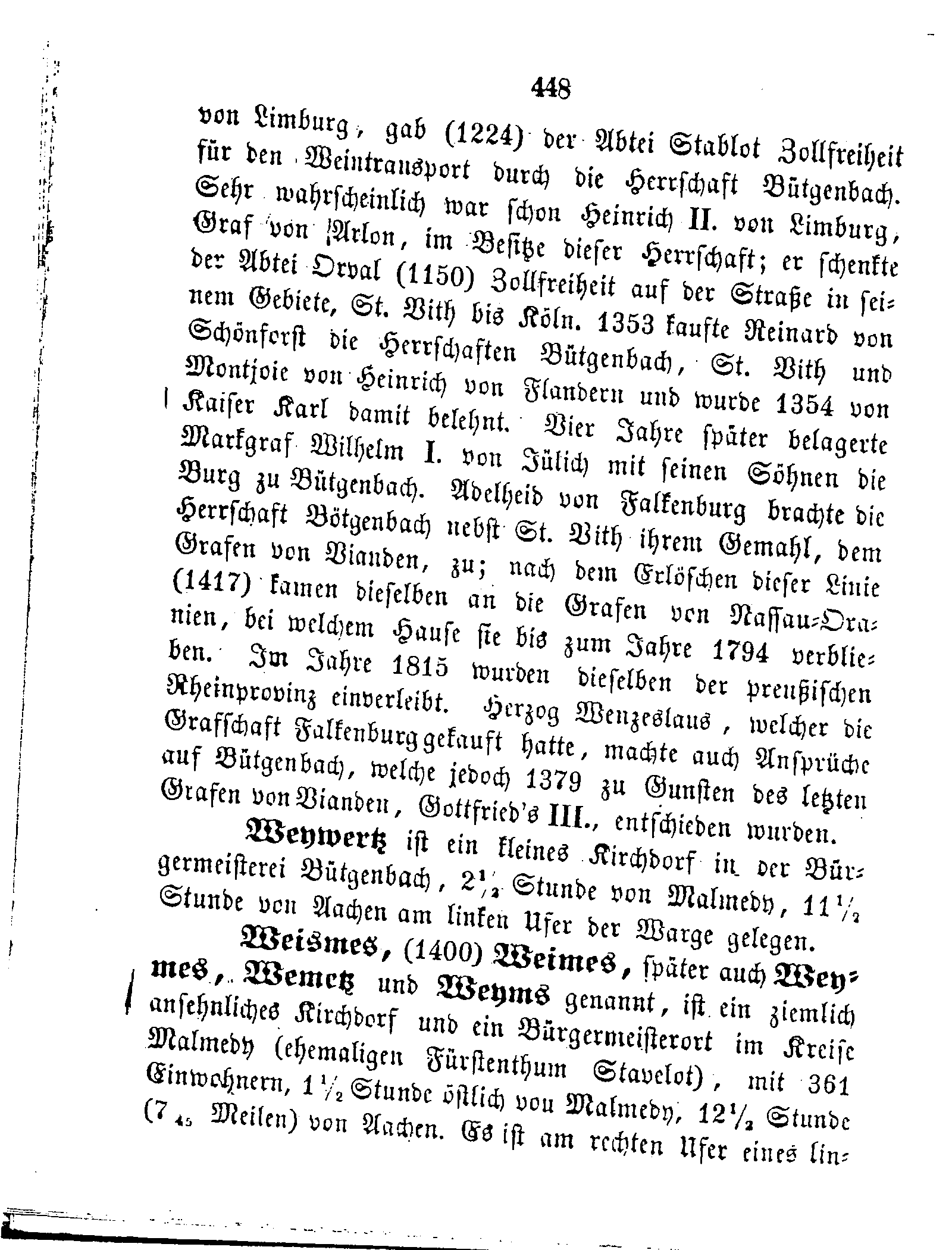 von Limburg, gab (1224) der Abtei Stablot Zollfreiheit für den Weintransport durch die Herrschaft Bütgenbach. Sehr wahrscheinlich war schon Heinrich II. von Limburg, Graf von Arlon, im Besitze dieser Herrschaft; er schenkte der Abtei Orval (1150) Zollfreiheit auf der Straße in seinem Gebiete, St. Vith bis Köln. 1353 kaufte Reinard von Schönforst die Herrschaften Bütgenbach, St. Vith und Montjoie von Heinrich von Flandern und wurde 1354 von Kaiser Karl damit belehnt. Vier Jahre später belagerte Markgraf Wilhelm I. von Jülich mit seinen Söhnen die Burg zu Bütgenbach. Adelheid von Falkenburg brachte die Herrschaft Bötgenbach nebst St. Vith ihrem Gemahl, dem Grafen von Vianden, zu; nach dem Erlöschen dieser Linie (1417) kamen dieselben an die Grafen von Nassau-Oranien, bei welchem Hause sie bis zum Jahre 1794 verblieben. Im Jahre 1815 wurden dieselben der preußischen Rheinprovinz einverleibt. Herzog Wenzeslaus, welcher die Grafschaft Falkenburg gekauft hatte, machte auch Ansprüche auf Bütgenbach, welche jedoch 1379 zu Gunsten des letzten Grafen von Vianden, Gottfried's III., entschieden wurden.