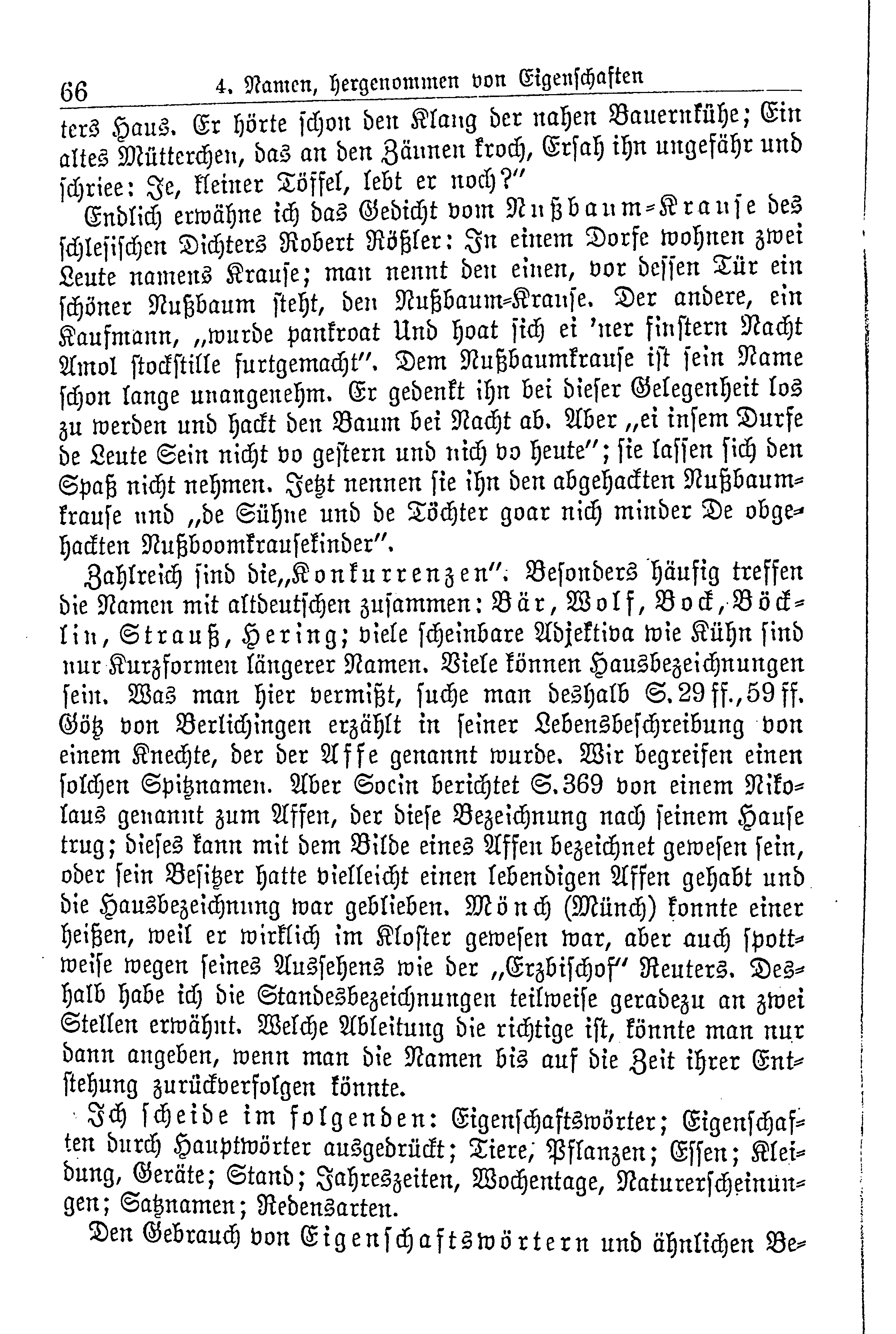 Zahlreich sind die „Konkurrenzen“. Besonders häufig treffen Namen mit altdeutschen zusammen: Bär, Wolf, Bock, Böcklin, Strauß, Hering; viele scheinbare Adjektiva wie Kühn sind nur Kurzformen längerer Namen. Viele können Hausbezeichnungen sein. Was man hier vermißt, suche man deshalb S. 29 ff., 59 ff. Götz von Berlichingen erzählt in seiner Lebensbeschreibung von einem Knechte, der der Affe genannt wurde. Wir begreifen einen solchen Spitznamen. Aber Socin berichtet S. 369 von einem Nikolaus genannt zum Affen, der diese Bezeichnung nach seinem Hause trug; dieses kann mit dem Bilde eines Affen bezeichnet gewesen sein, oder sein Besitzer hatte vielleicht einen lebendigen Affen gehabt und die Hausbezeichnung war geblieben. Mönch (Münch) konnte einer heißen, weil er wirklich im Kloster gewesen war, aber auch spottweise wegen seines Aussehens wie der „Erzbischof“ Reuters. Deshalb habe ich die Standesbezeichnungen teilweise geradezu an zwei Stellen erwähnt. Welche Ableitung die richtige ist, könnte man nur dann angeben, wenn man die Namen bis auf die Zeit ihrer Entstehung zurückverfolgen könnte.