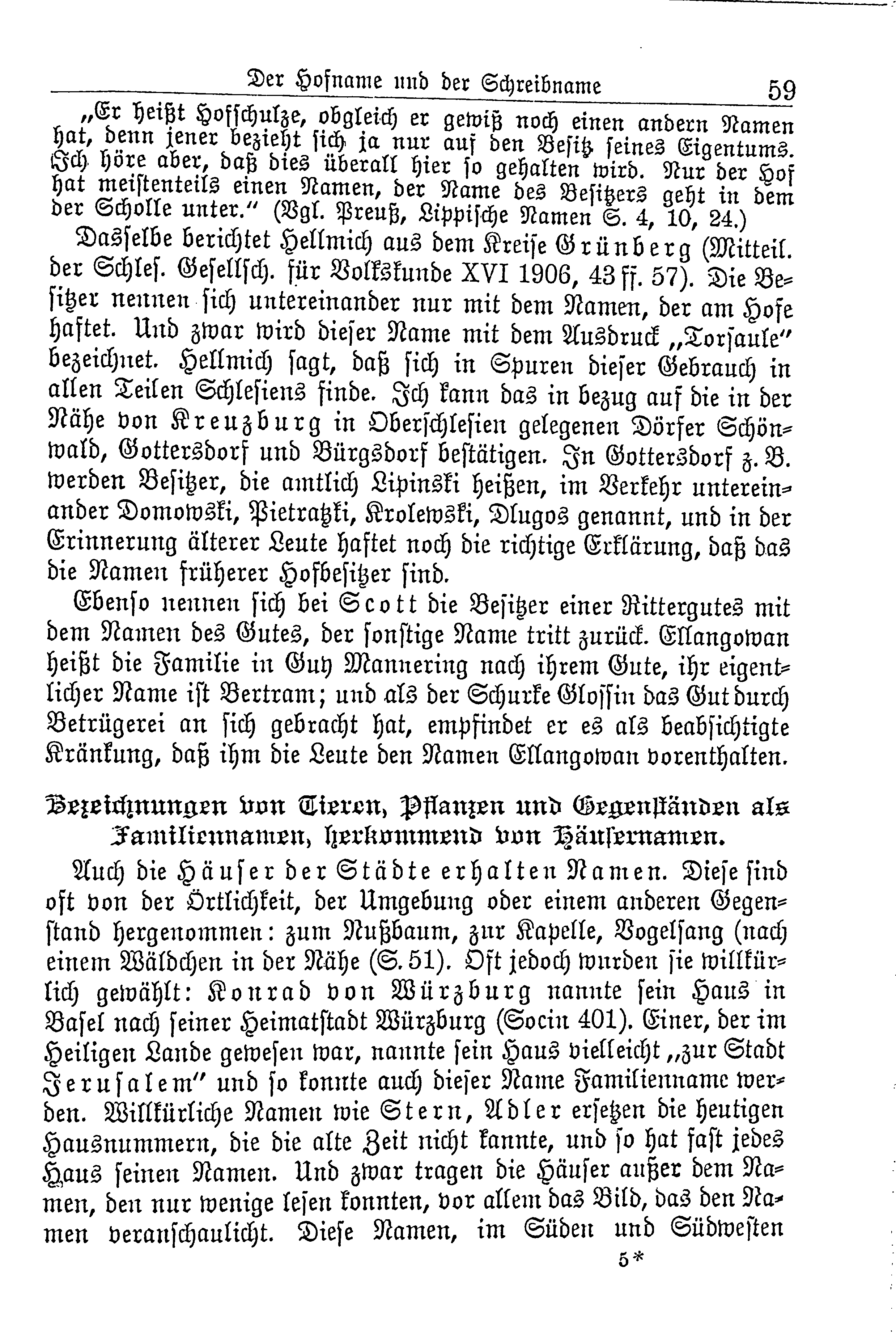 Dasselbe berichtet Hellmich aus dem Kreise Grünberg (Mitteil. der Schles. Gesellsch. für Volkskunde XVI 1906, 43ff. 57). Die Besitzer nennen sich untereinander nur mit dem Namen, der am Hofe haftet. Und zwar wird dieser Name mit dem Ausdruck „Torsaule“ bezeichnet. Hellmich sagt, daß sich in Spuren dieser Gebrauch in allen Teilen Schlesiens finde. Ich kann das in bezug auf die in der Nähe von Kreuzburg in Oberschlesien gelegenen Dörfer Schönwald, Gottersdorf und Bürgsdorf bestätigen. In Gottersdorf z. B. werden Besitzer, die amtlich Lipinski heißen, im Verkehr untereinander Domowski, Pietratzki, Krolewski, Dlugos genannt, und in der Erinnerung älterer Leute haftet noch die richtige Erklärung, daß das die Namen früherer Hofbesitzer sind.