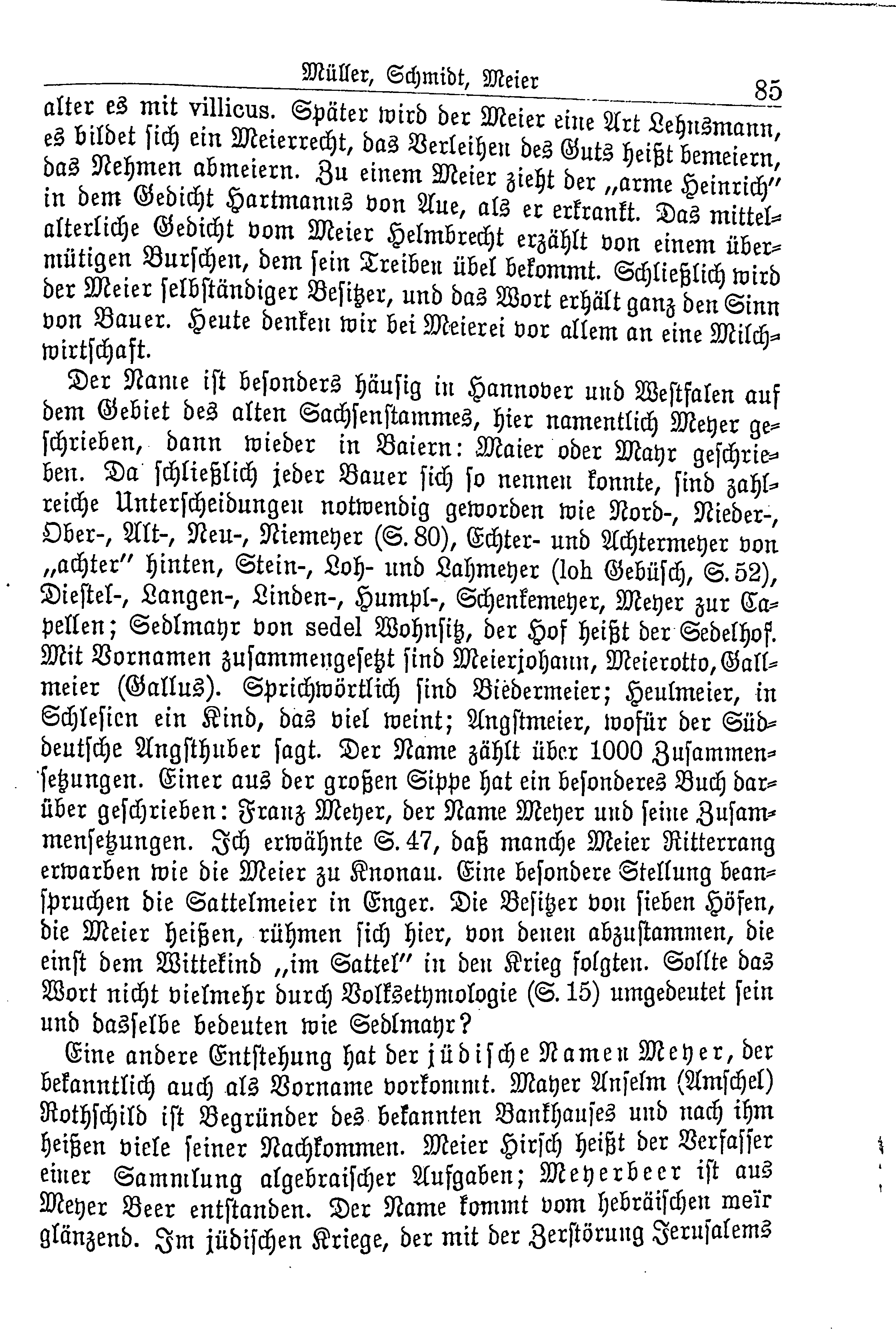 Der Name ist besonders häufig in Hannover und Westfalen auf dem Gebiet des alten Sachsenstammes, hier namentlich Meyer geschrieben, dann wieder in Baiern: Maier oder Mayr geschrieben. Da schließlich jeder Bauer sich so nennen konnte, sind zahlreiche Unterscheidungen notwendig geworden wie Nord-, Nieder-, Ober-, Alt-, Neu-, Niemeyer (S. 80), Echter- und Achtermeyer von „achter“ hinten. Stein-, Loh- und Lahmeyer (loh Gebüsch, S. 52), Diestel-, Langen-, Linden-, Humpl-, Schenkemeyer, Meyer zur Capellen; Sedlmayr von sedel Wohnsitz, der Hof heißt der Sedelhof. Mit Vornamen zusammengesetzt sind Meierjohann, Meierotto, Gallmeier (Gallus). Sprichwörtlich sind Biedermeier; Heulmeier, in Schlesien ein Kind, das viel weint; Angstmeier, wofür der Süddeutsche Angsthuber sagt. Der Name zählt über 1000 Zusammensetzungen. Einer aus der großen Sippe hat ein besonderes Buch darüber geschrieben: Franz Meyer, der Name Meyer und seine Zusammensetzungen. Ich erwähnte S. 47, daß manche Meier Ritterrang erwarben wie die Meier zu Knonau. Eine besondere Stellung beanspruchen die Sattelmeier in Enger. Die Besitzer von sieben Höfen, die Meier heißen, rühmen sich hier, von denen abzustammen, die einst dem Wittekind „im Sattel“ in den Krieg folgten. Sollte das Wort nicht vielmehr durch Volksetymologie (S. 15) umgedeutet sein und dasselbe bedeuten wie Sedlmayr?