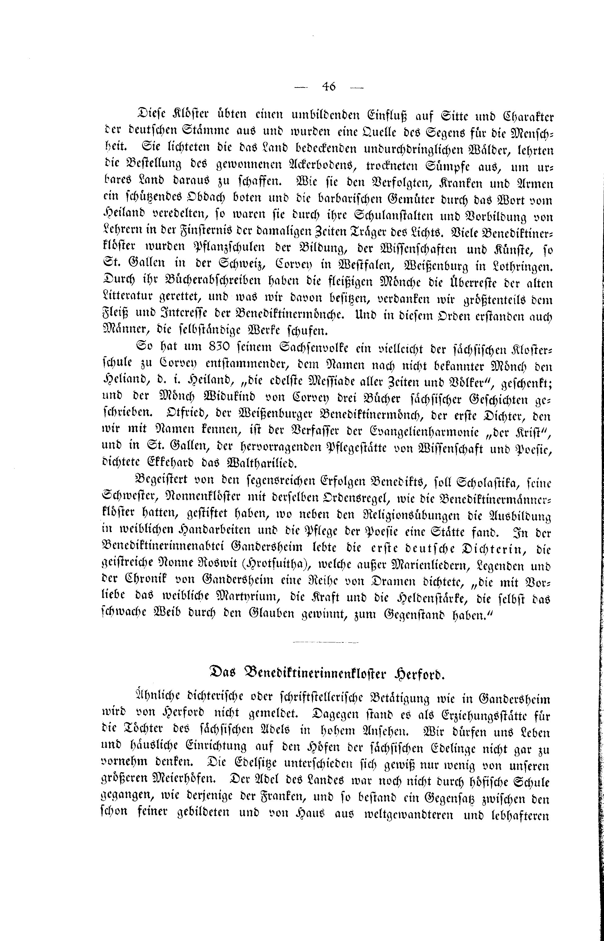 Begeistert von den segensreichen Erfolgen Benedikts, soll Scholastik«, seine Schwester, Nonnenklöster mit derselben Ordensregel, wie die Benediktinermännerklöster hatten, gestiftet haben, wo neben den Religionsübungen die Ausbildung in weiblichen Handarbeiten und die Pflege der Poesie eine Stätte fand. In der Benediktinerinnenabtei Gandersheim lebte die erste deutsche Dichterin, die geistreiche Nonne Roswit (Hrotsuitha), welche außer Marienliedern, Legenden und der Chronik von Gandersheim eine Reihe von Dramen dichtete, „die mit Vorliebe das weibliche Martyrium, die Kraft und die Heldenstärke, die selbst das schwache Weib durch den Glauben gewinnt, zum Gegenstand haben.“