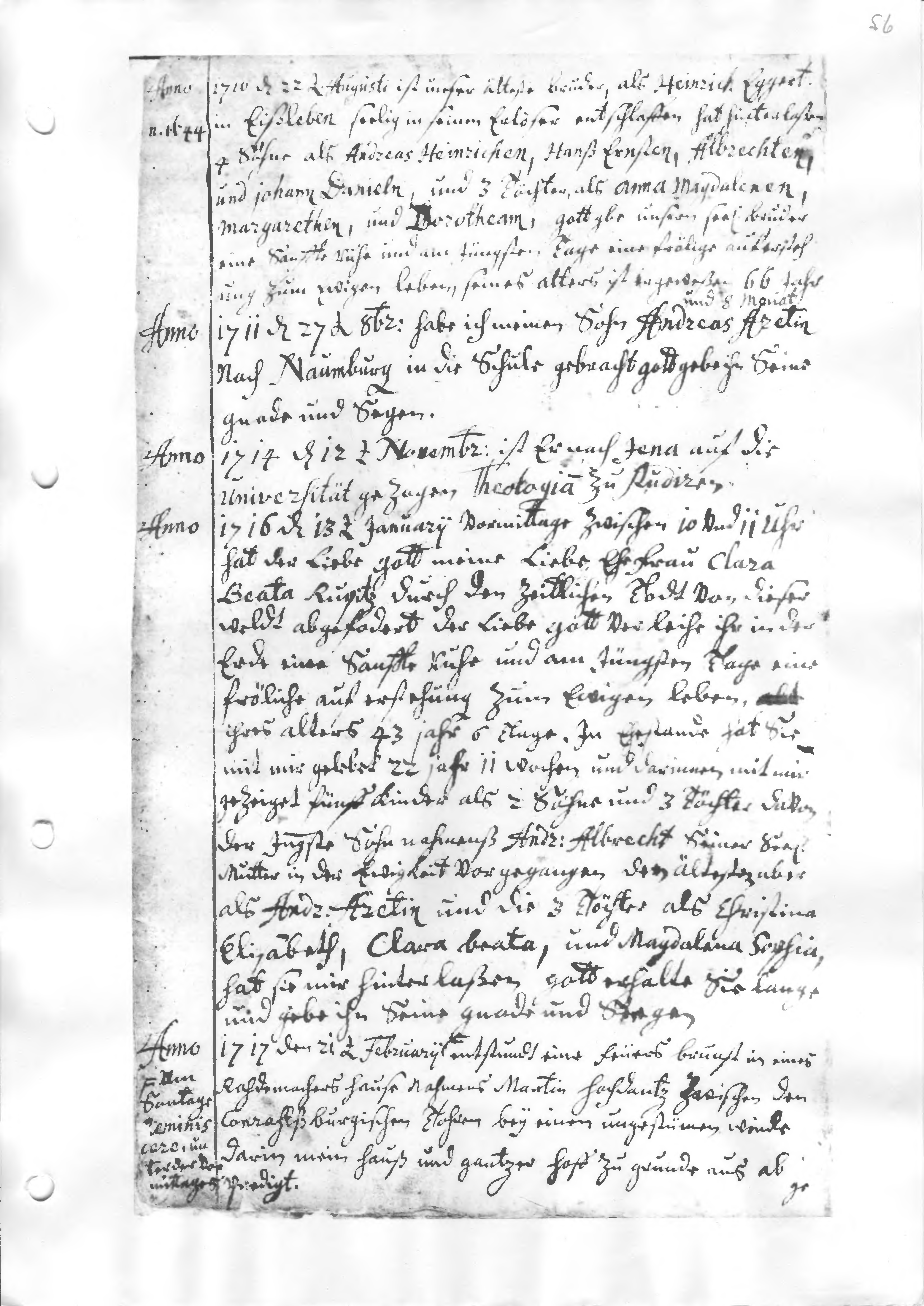 Anno 1710 den 22. Augusti ist unser ältester Bruder, als Heinrich Eggert in nat.[1] 1644 Eisleben seelig in seinem Erlöser entschlafen, hat hinterlassen 4 Söhne als Andreas Heinrichen, Hanß Ernsten, Albrechten und Johann Danieln und 3 Töchter als Anna Magdalenen, Margarethen und Dorothean. Gott gebe unserem sel. Bruder eine sanffte Ruhe und am jüngsten Tage eine fröhliche Auferstehung zum ewigen Leben. Seines Alters ißt er gewesen 66 Jahr und 8 Monate.