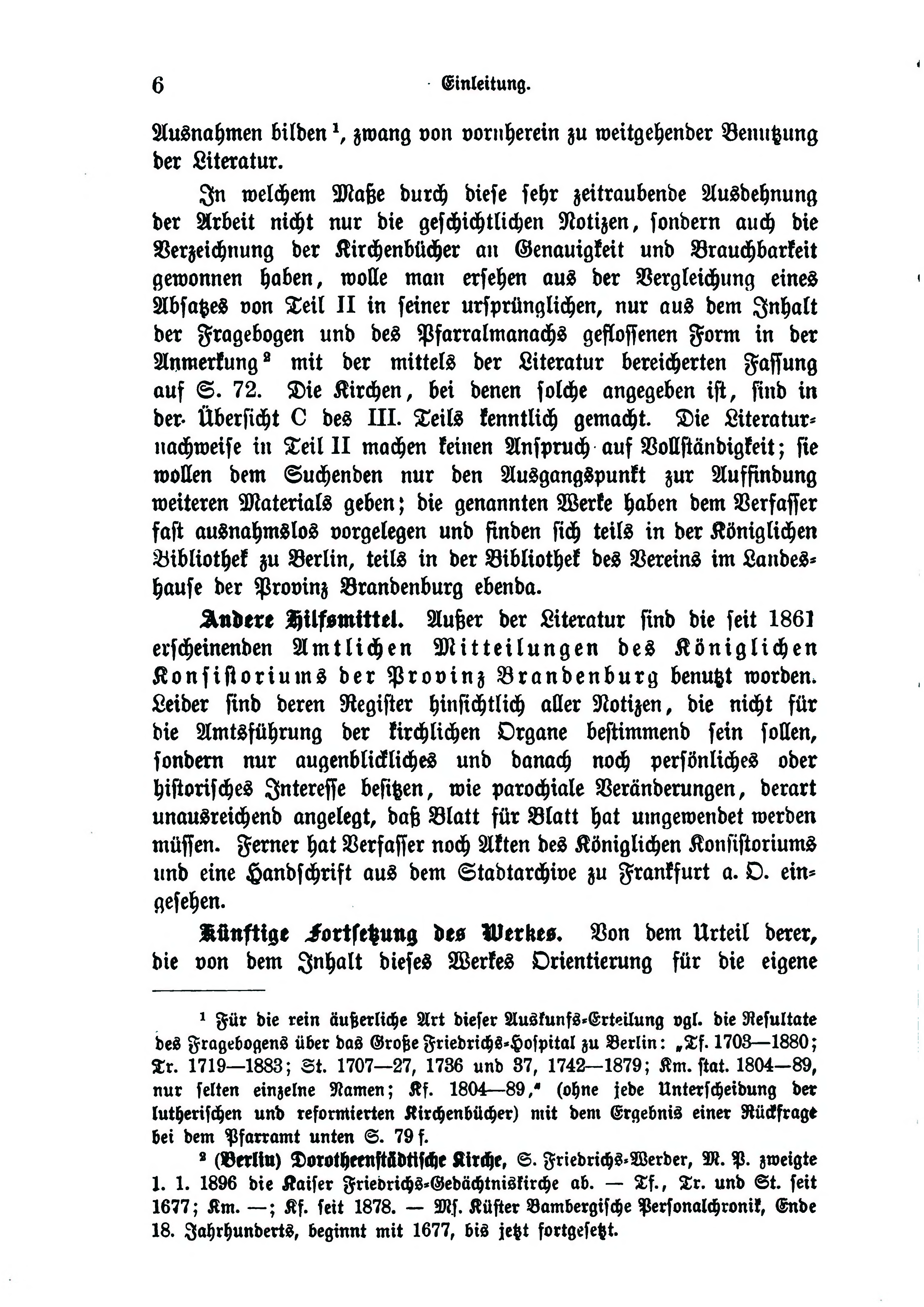 Andere Hilfsmittel. Außer der Literatur sind die seit 1861 erscheinenden Amtlichen Mitteilungen des Königlichen Konsistoriums der Provinz Brandenburg benutzt worden. Leider sind deren Register hinsichtlich aller Notizen, die nicht für die Amtsführung der kirchlichen Organe bestimmend sein sollen, sondern nur augenblickliches und danach noch persönliches oder historisches Interesse besitzen, wie parochiale Veränderungen, derart unausreichend angelegt, daß Blatt für Blatt hat umgewendet werden müssen. Ferner hat Verfasser noch Akten des Königlichen Konsistoriums und eine Handschrift aus dem Stadtarchive zu Frankfurt a. O. eingesehen.