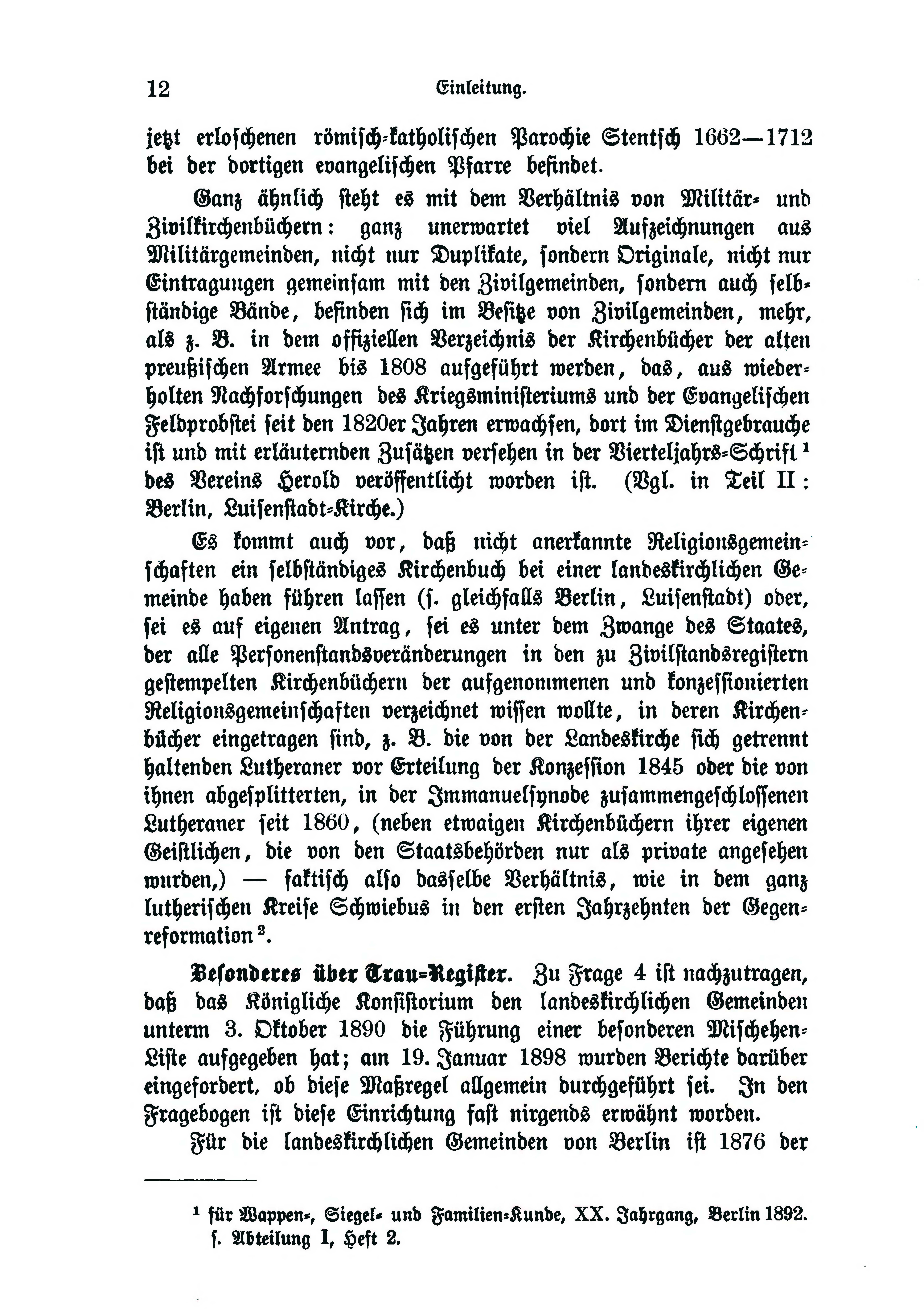 Ganz ähnlich steht es mit dem Verhältnis von Militär- und Zivilkirchenbüchern: ganz unerwartet viel Auszeichnungen aus Militärgemeinden, nicht nur Duplikate, sondern Originale, nicht nur Eintragungen gemeinsam mit den Zivilgemeinden, sondern auch selbständige Bände, befinden sich im Besitze von Zivilgemeinden, mehr, als z. B. in dem offiziellen Verzeichnis der Kirchenbücher der alten preußischen Armee bis 1808 ausgeführt werden, das, aus wiederholten Nachforschungen des Kriegsministeriums und der Evangelischen Feldprobstei seit den 1820er Jahren erwachsen, dort im Dienstgebrauche ist und mit erläuternden Zusätzen versehen in der Vierteljahrs-Schrift - des Vereins Herold [1] veröffentlicht worden ist. (Vgl. in Teil II: Berlin, Luisenstadt-Kirche.)