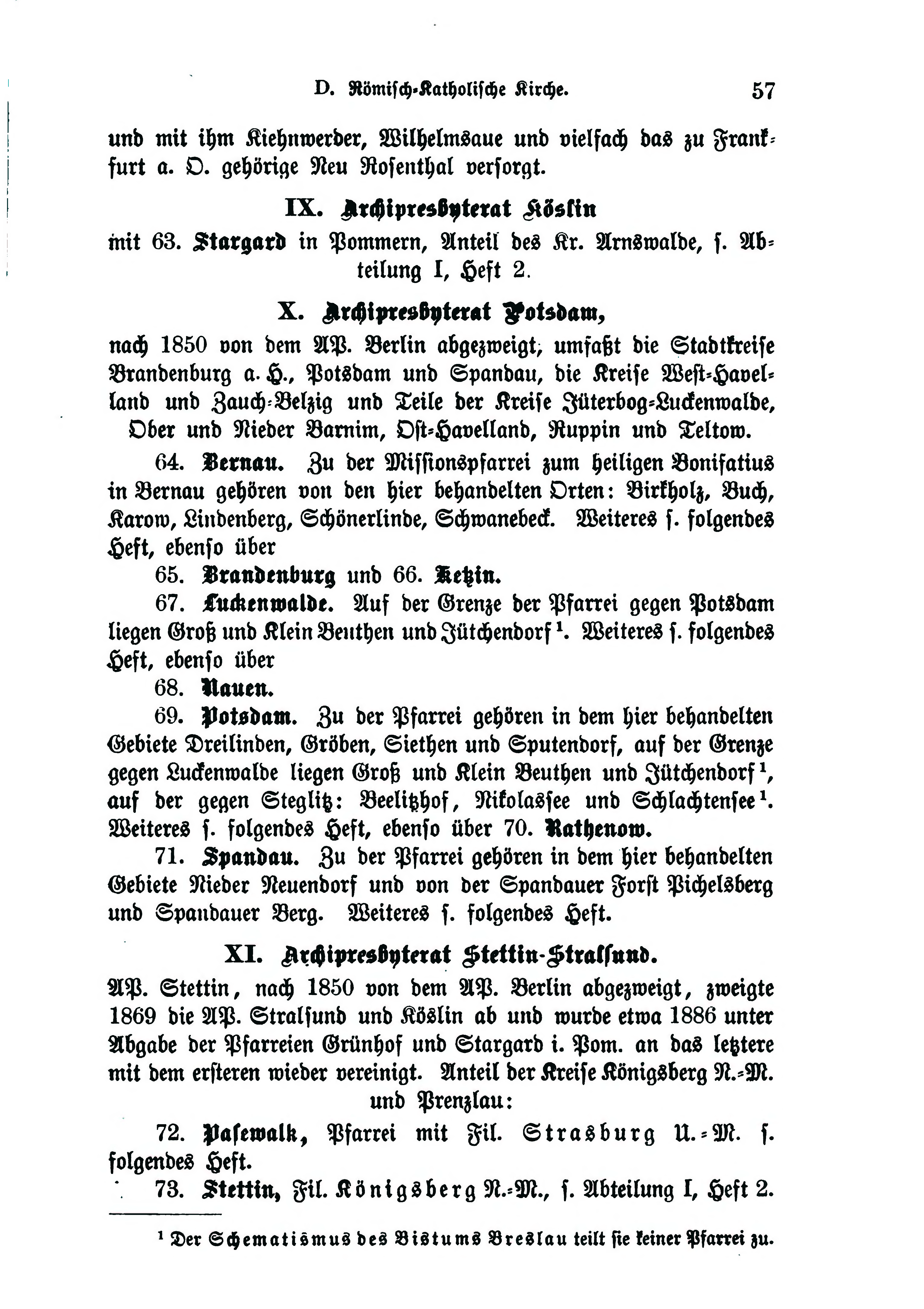 - 64. Bernau. Zu der Missionspfarrei zum heiligen Bonifatius in Bernau gehören von den hier behandelten Orten: Birkholz, Buch, Karow, Lindenberg, Schönerlinde, Schwanebeck. Weiteres s. folgendes Heft, ebenso über
