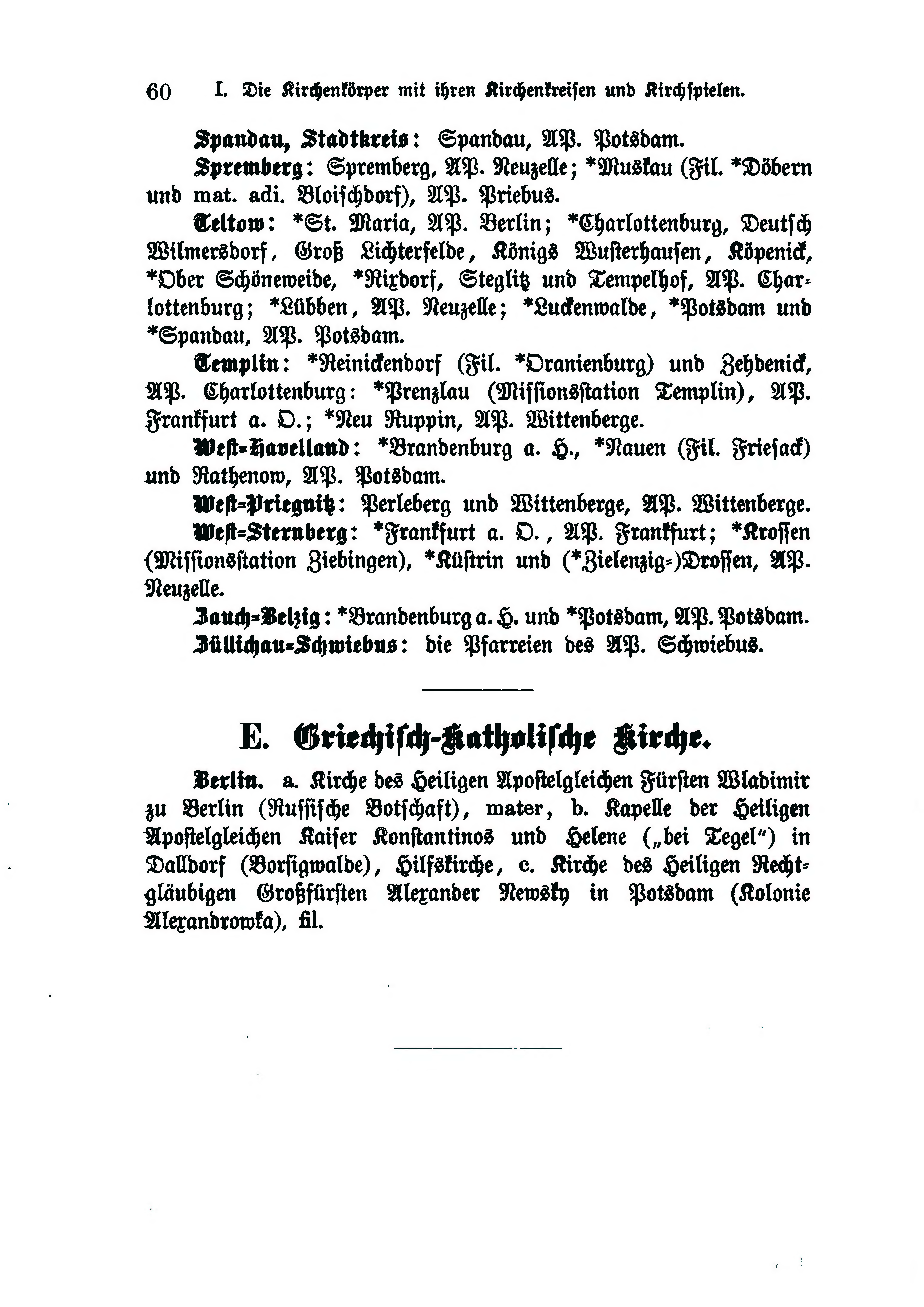 - Teltow: *St. Maria, AP. Berlin; *Charlottenburg, Deutsch Wilmersdorf, Groß Lichterfelde, Königs Wusterhausen, Köpenick, *Ober Schöneweide, *Rixdorf, Steglitz und Tempelhof, AP. Charlottenburg; *Lübben, AP. Neuzelle; *Luckenwalde, *Potsdam und 'Spandau, AP. Potsdam.