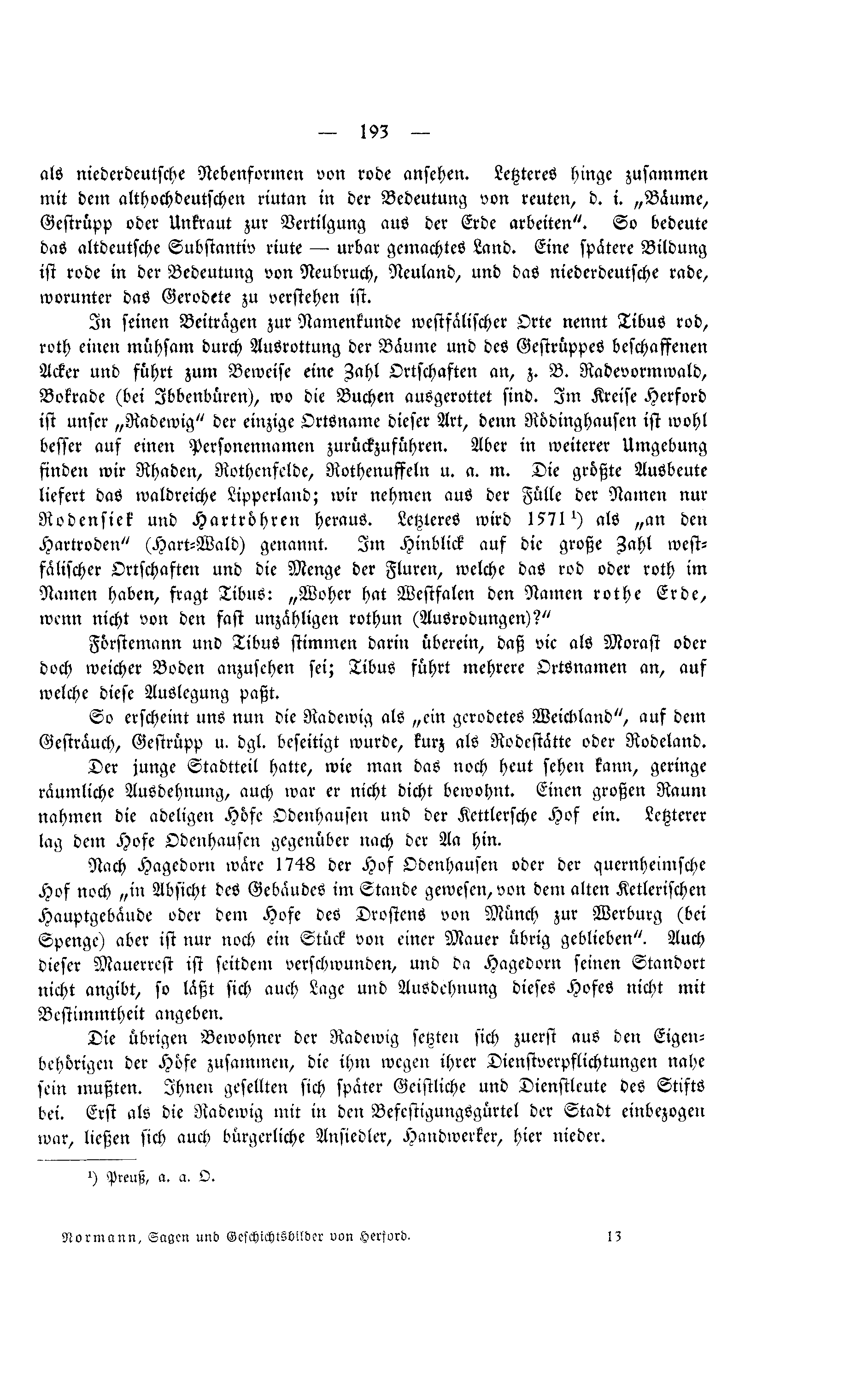 In seinen Beiträgen zur Namenkunde westfälischer Orte nennt Tibus rod, roth einen mühsam durch Ausrottung der Bäume und des Gestrüppes beschaffenen Acker und führt zum Beweise eine Zahl Ortschaften an, z. B. Radevormwald, Bokrade (bei Ibbenbüren), wo die Buchen ausgerottet sind. Im Kreise Herford ist unser „Radewig“ der einzige Ortsname dieser Art, denn Rödinghausen ist wohl besser auf einen Personennamen zurückzuführen. Aber in weiterer Umgebung finden wir Rhaden, Rothenfelde, Rothenuffeln u. a. m. Die größte Ausbeute liefert das waldreiche Lipperland; wir nehmen aus der Fülle der Namen nur Rodensiek und Hartröhren heraus. Letzteres wird 1571[1] als „an den Hartroden“ (Hart-Wald) genannt. Im Hinblick auf die große Zahl westfälischer Ortschaften und die Menge der Fluren, welche das rod oder roth im Namen haben, fragt Tibus: „Woher hat Westfalen den Namen rothe Erde, wenn nicht von den fast unzähligen rothun (Ausrodungen)?“