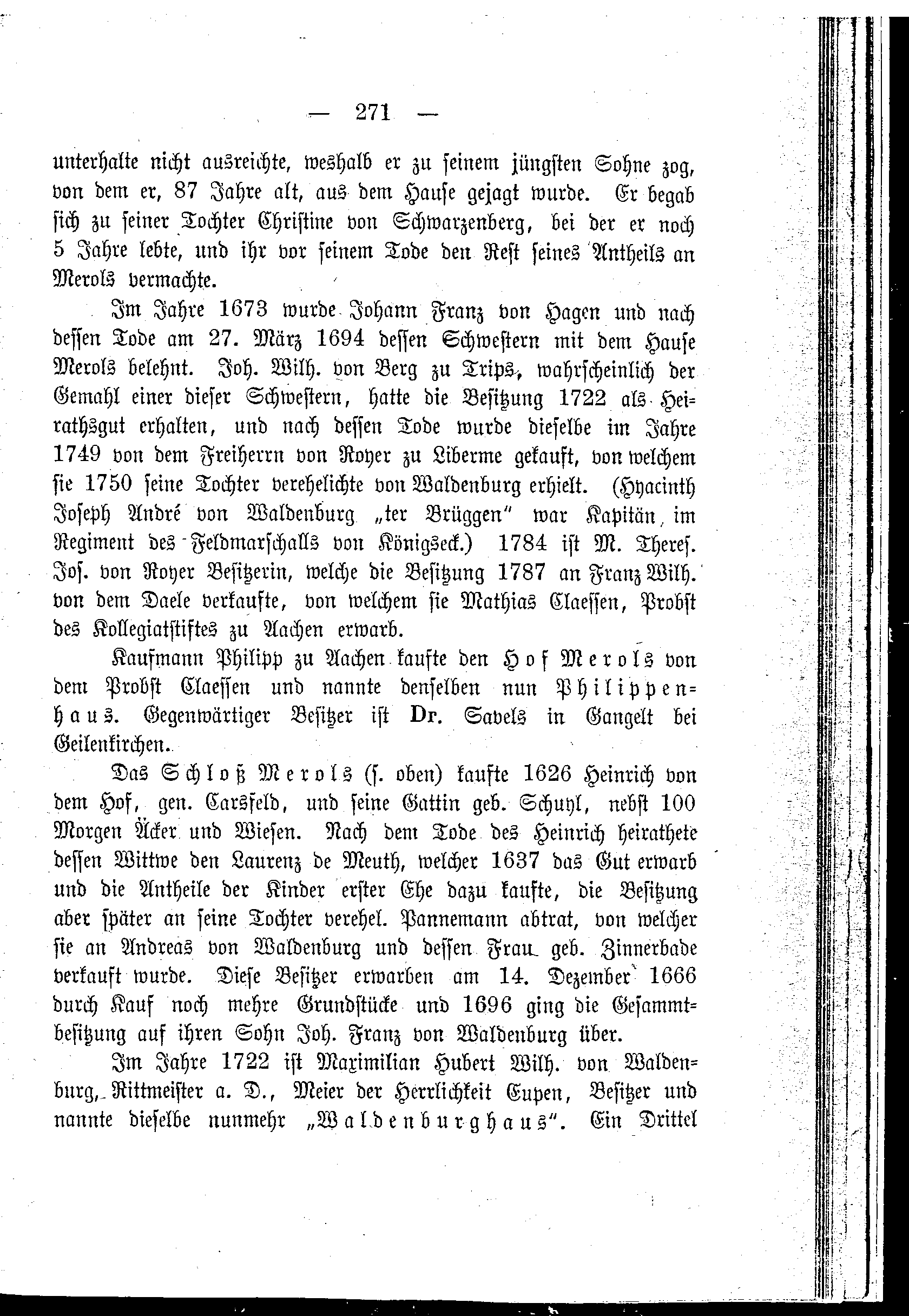 Das Schloß Merols (s. oben) kaufte 1626 Heinrich von dem Hof, gen. Carsfeld, und seine Gattin geb. Schuyl, nebst 100 Morgen Äcker und Wiesen. Nach dem Tode des Heinrich heirathete dessen Wittwe den Laurenz de Meuth, welcher 1637 das Gut erwarb und die Antheile der Kinder erster Ehe dazu kaufte, die Besitzung aber später an seine Tochter verehel. Pannemann abtrat, von welcher sie an Andreas von Waldenburg und dessen Frau geb. Zinnerbade verkauft wurde. Diese Besitzer erwarben am 14. Dezember 1666 durch Kauf noch mehre Grundstücke und 1696 ging die Gesammtbesitzung auf ihren Sohn Joh. Franz von Waldenburg über.