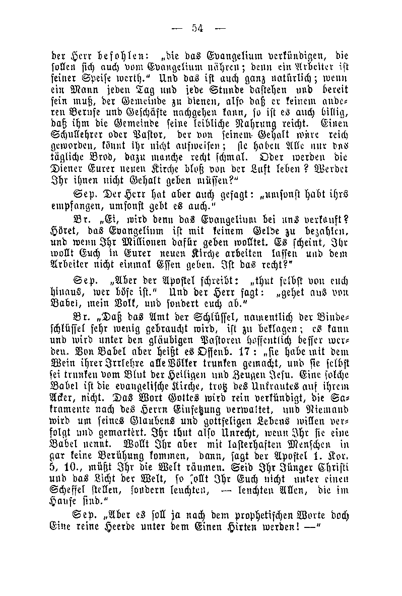 der Herr befohlen: "die das Evangelium verkündigen, die sollen sich auch vom Evangelium nähren; denn ein Arbeiter ist seiner Speise verth." Und das ist auch ganz natürlich; wenn ein Mann jeden Tag und jede Stunde dastehen und bereit sein muß, der Gemeinde zu dienen, also daß er seinen anderen Berufe und Geschäfte nachgehen kann, so ist es auch billig, daß ihm die Gemeinde seine leibliche Nahrung reicht. Einen Schullehrer oder Pastor, der von seinem Gehalt wäre reich geworden, könnt ihr nicht ausweisen; sie haben Alle nur das tägliche Brod, dazu manche recht schmal. Oder werden die Diener Eurer neuen Kirche bloß von der Luft leben? Werdet Ihr ihnen nicht Gehalt geben müssen?" Sep. Der Herr hat aber auch gefragt: "umsonst habt ihrs empfangen, umsonst gebt es auch." Br. "Ei, wird denn das Evangelium bei uns verkauft? Höret, das Evangelium ist mit keinem Gelde zu bezahlen. und wenn Ihr Millionen dafür geben wolltet. Es scheint, Ihr wollt Euch in Eurer neuen Kirche arbeiten lassen und dem Arbeiter nicht einmal Essen geben. Ist das recht?" Sep. "Aber der Apostel schreibt: "thut selbst von euch hinaus, wer böse ist." Und der Herr sagt: "gehet aus von Babel, mein Volk, und sondert euch ab." Br. "Daß das Amt der Schlüssel, namentlich der Bindeschlüssel sehr wenig gebraucht wird, ist zu beklagen; es kann und wird unter den gläubigen Pastoren hoffentlich besser werden. Von Babel aber heißt es Offenb. 17: "sie habe mit dem Wein ihrer Irrlehre alle Völker trunken gemacht, und sie selbst sei trunken vom Blut der Heiligen und Zeugen Jesu. Eine solche Babel ist die evangelische Kirche, trotz des Unkrautes auf ihrem Ader, nicht. Das Wort Gottes wird rein verkündigt, die Sakramente nach des Herrn Einsetzung verwaltet, und Niemand wird um seines Glaubens und gottseligen Lebens willen verfolgt und gemartert. Ihr thut also Unrecht, wenn Ihr sie eine Babel nennt. Wollt Ihr aber mit lasterhaften Menschen in gar keine Berührung kommen, dann, sagt der Apostel 1. Kor. 5, 10., müßt Ihr die Welt räumen. Seid Ihr Jünger Christi und das LIcht der Welt, so sollt Ihr Euch nicht unter einen Schefffel stellen, sondern leuchten. -- leuchten Allen, die im Hause sind." Sep. "Aber es soll ja nach dem prophetischen Worte doch Eine reine Heerde unter dem Einen Hirten werden! --"
