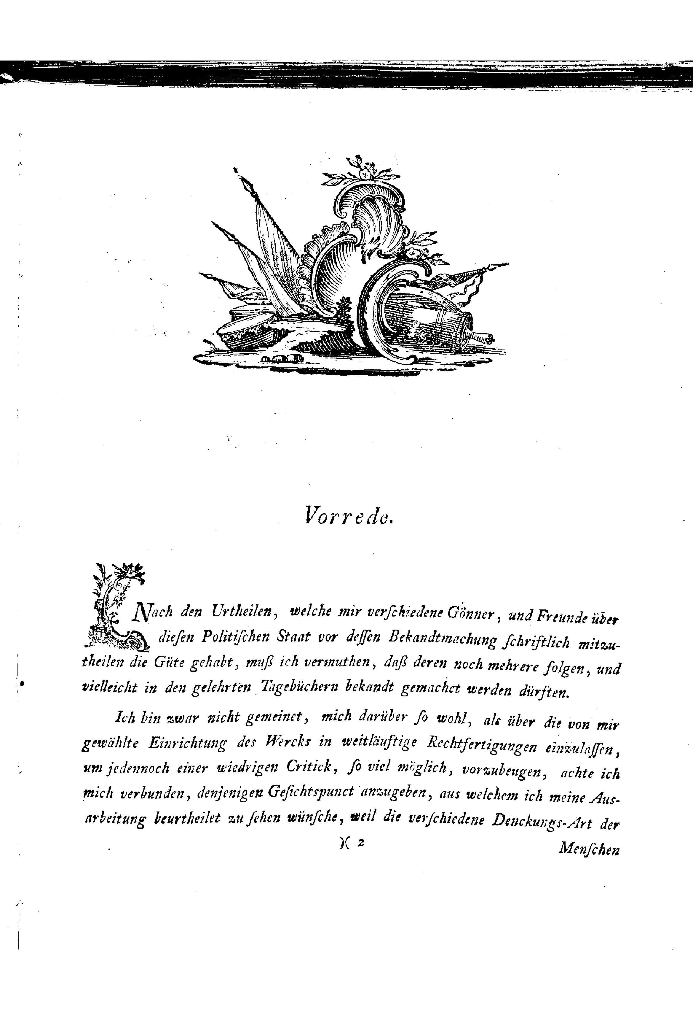 Nach den Urtheilen, welche mir verschiedene Gönner, und Freunde über diesen Politischen Staat vor dessen Bekandtmachung schriftlich mitzutheilen die Güte gehabt, muß ich vermuthen, daß deren noch mehrere folgen, und vielleicht in den gelehrten Tagebüchern bekannt gemachet werden dürfen. Ich bin zwar nicht gemeinet, mich darüber so wohl, als über die von mir gewählte Einrichtung des Wercke in weltläuftige Rechtfertigungen einzulassen, um jedernoch einer wiedrigen Critick, so viel möglich, vorzubeugen, achte ich mich verbunden, denjenigen Gesichtspunct anzugeben, aus welchem ich meine Ausarbeitung beurtheilet zu sehen wünsche, weil die verschiedene Denckungs-Art der Menschen