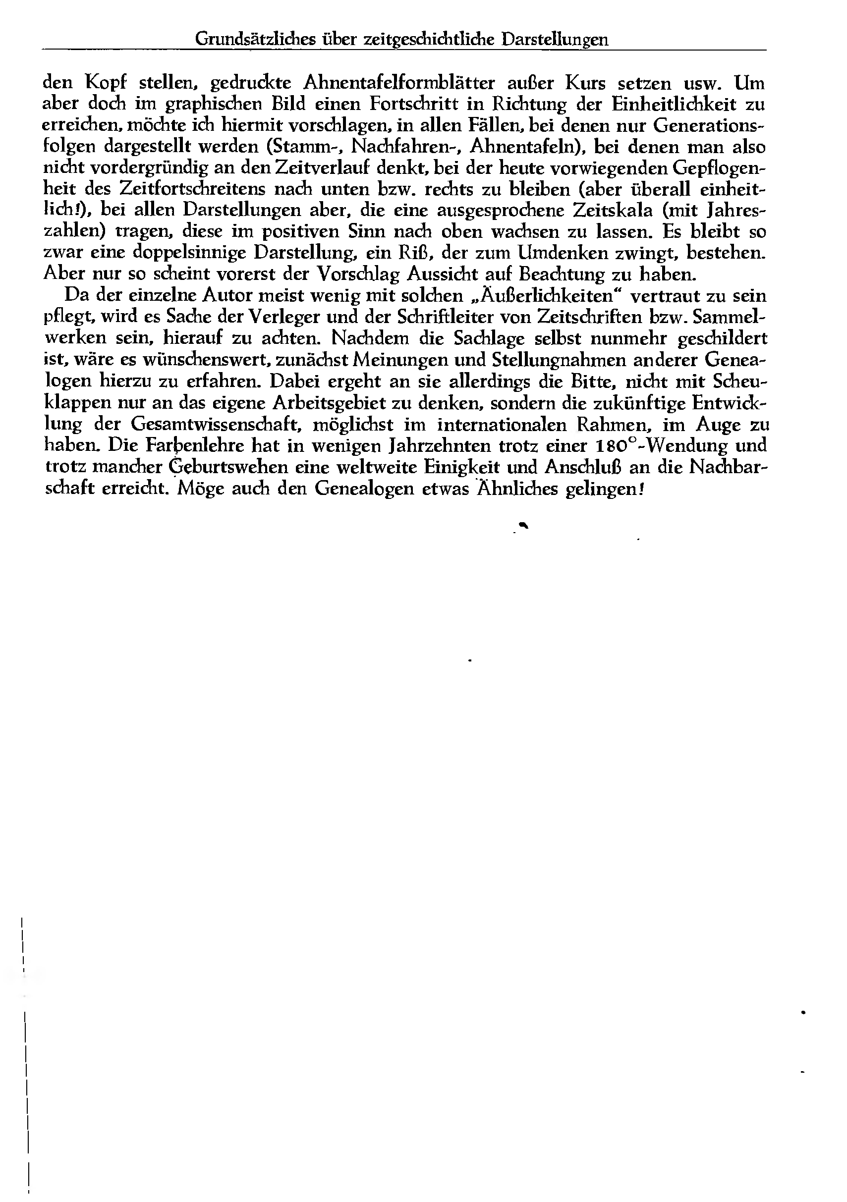 den Kopf stellen, gedruckte Ahnentafelformblätter außer Kurs setzen usw. Um aber doch im graphischen Bild einen Fortschritt in Richtung der Einheitlichkeit zu erreichen, möchte ich hiermit vorschlagen, in allen Fällen, bei denen nur Generationsfolgen dargestellt werden (Stamm-, Nachfahren-, Ahnentafeln), bei denen man also nicht vordergründig an den Zeitverlauf denkt, bei der heute vorwiegenden Gepflogenheit des Zeitfortschreitens nach unten bzw. rechts zu bleiben (aber überall einheitlich!), bei allen Darstellungen aber, die eine ausgesprochene Zeitskala (mit Jahreszahlen) tragen, diese im positiven Sinn nach oben wachsen zu lassen. Es bleibt so zwar eine doppelsinnige Darstellung, ein Riß, der zum Umdenken zwingt, bestehen. Aber nur so scheint vorerst der Vorschlag Aussicht auf Beachtung zu haben.