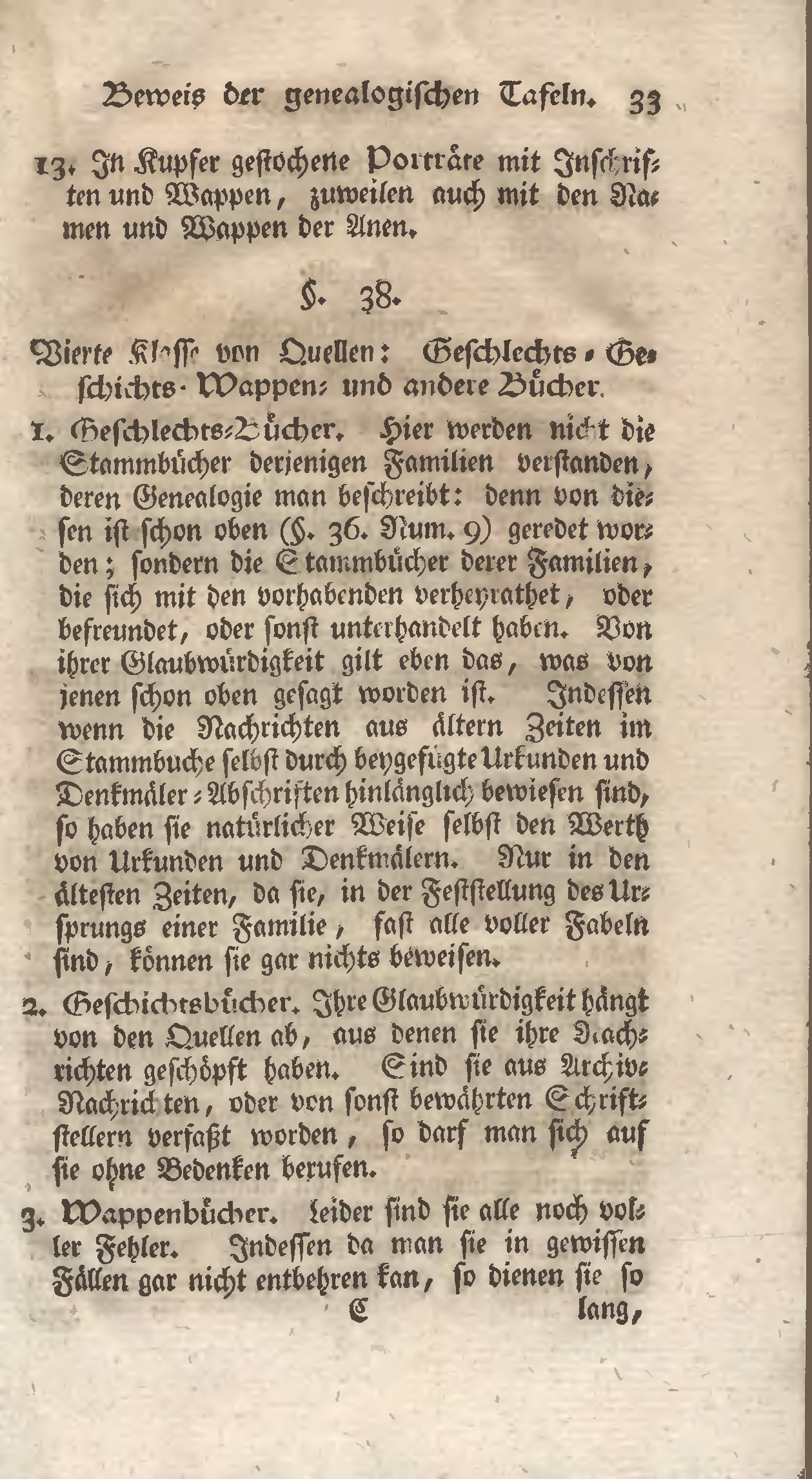 1. Geschlechts-Bücher. Hier werden nicht die Stammbücher derjenigen Familien verstanden, deren Genealogie man beschreibt: denn von diesen ist schon oben (§. 36. Num. 9) geredet worden; sondern die Stammbücher derer Familien, die sich mit den vorhandenen verheyrathet, oder befreundet, oder sonst unterhandelt haben. Von ihrer Glaubwürdigkeit gilt eben das, was von jenen schon oben gesagt worden ist. Indessen wenn die Nachrichten aus ältern Zeiten im Stammbuche selbst durch beygefügte Urkunden und Denkmäler-Abschriften hinlänglich bewiesen sind, so haben sie natürlicher Weise selbst den Werth von Urkunden und Denkmälern. Nur in den ältesten Zeiten, da sie, in der Feststellung des Ursprungs einer Familie, fast alle voller Fabeln sind, können sie gar nichts beweisen.