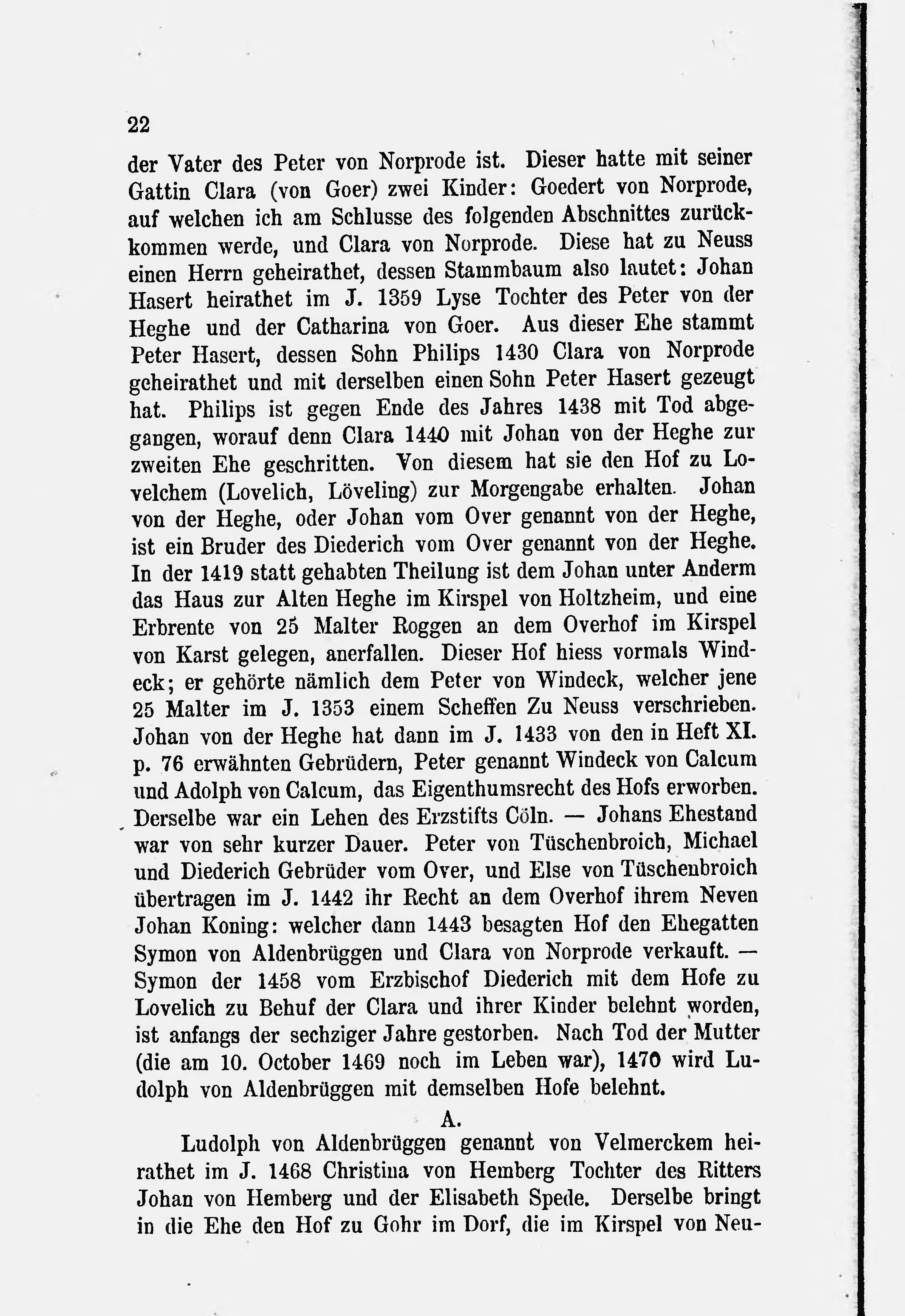 der Vater des Peter von Norprode ist. Dieser hatte mit seiner Gattin Clara (von Goer) zwei Kinder: Goedert von Norprode, auf welchen ich am Schlusse des folgenden Abschnittes zurückkommen werde, und Clara von Norprode. Diese hat zu Neuss einen Herrn geheirathet, dessen Stammbaum also lautet: Johan Hasert heirathet im J. 1359 Lyse Tochter des Peter von der Heghe und der Catharina von Goer. Aus dieser Ehe stammt Peter Hasert, dessen Sohn Philips 1430 Clara von Norprode geheirathet und mit derselben einen Sohn Peter Hasert gezeugt hat. Philips ist gegen Ende des Jahres 1438 mit Tod abgegangen, worauf denn Clara 1440 mit Johan von der Heghe zur zweiten Ehe geschritten. Von diesem hat sie den Hof zu Lovelchem (Lovelich, Löveling) zur Morgengabe erhalten. Johan von der Heghe, oder Johan vom Over genannt von der Heghe, ist ein Bruder des Diederich vom Over genannt von der Heghe. In der 1419 statt gehabten Theilung ist dem Johan unter Anderm das Haus zur Alten Heghe im Kirspel von Holtzheim, und eine Erbrente von 25 Malter Roggen an dem Overhof im Kirspel von Karst gelegen, anerfallen. Dieser Hof hiess vormals Windeck; er gehörte nämlich dem Peter von Windeck, welcher jene 25 Malter im J. 1353 einem Scheffen Zu Neuss verschrieben. Johan von der Heghe hat dann im J. 1433 von den in Heft XI. p. 76 erwähnten Gebrüdern, Peter genannt Windeck von Calcum und Adolph von Calcum, das Eigenthumsrecht des Hofs erworben. Derselbe war ein Lehen des Erzstifts Cöln. — Johans Ehestand war von sehr kurzer Dauer. Peter von Tüschenbroich, Michael und Diederich Gebrüder vom Over, und Else von Tüschenbroich übertragen im J. 1442 ihr Recht an dem Overhof ihrem Neven Johan Koning: welcher dann 1443 besagten Hof den Ehegatten Symon von Aldenbrüggen und Clara von Norprode verkauft. — Symon der 1458 vom Erzbischof Diederich mit dem Hofe zu Lovelich zu Behuf der Clara und ihrer Kinder belehnt worden, ist anfangs der sechziger Jahre gestorben. Nach Tod der Mutter (die am 10. October 1469 noch im Leben war), 1470 wird Ludolph von Aldenbrüggen mit demselben Hofe belehnt.