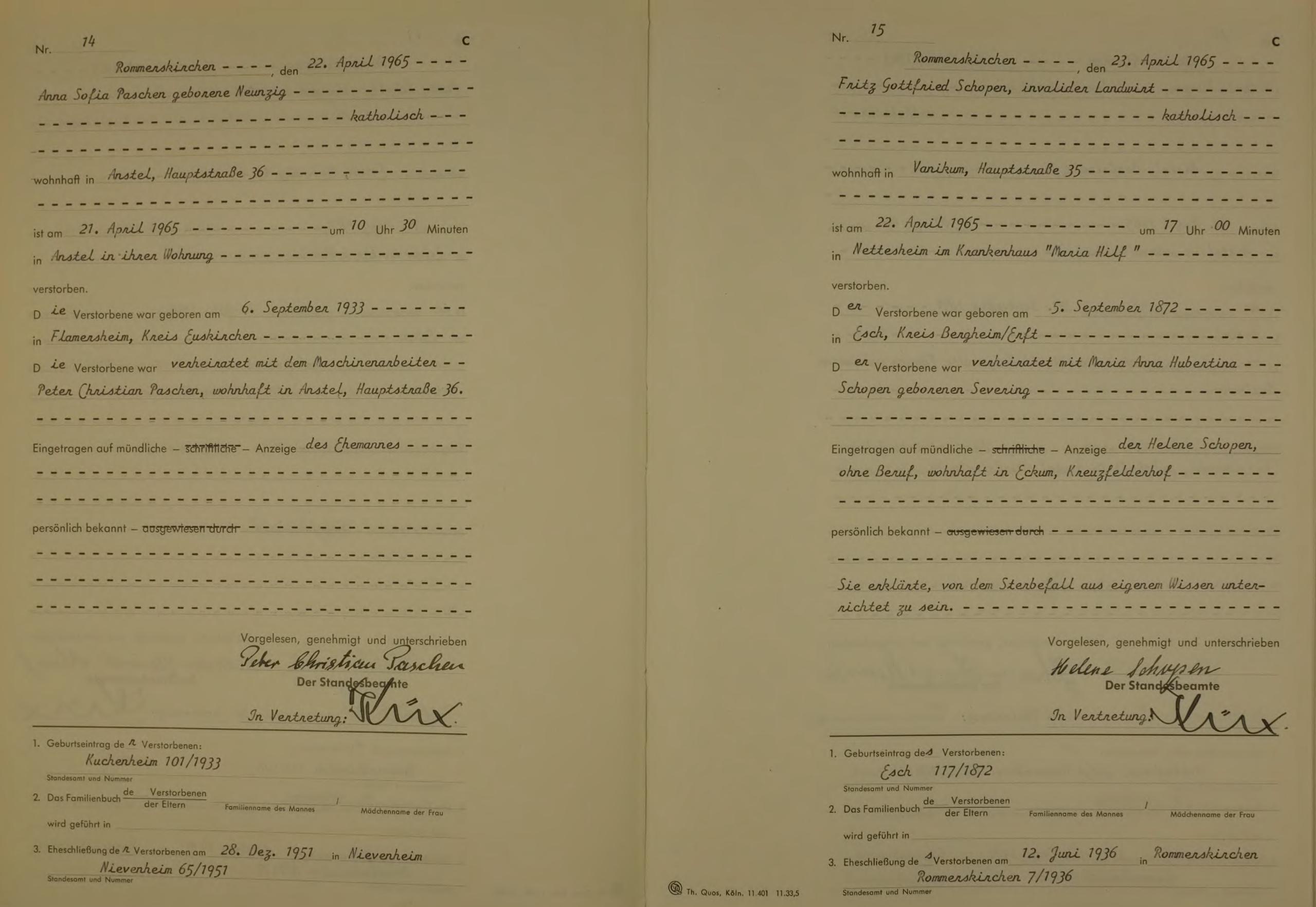 | aktuell | 09:30, 21. Jun. 2013 | 1.723 × 2.273, 35 Seiten (5,36 MB) | KlausErdmann (Diskussion • Beiträge) | {{Information |Beschreibung = ;Standesamt Rommerskirchen, Sterberegister von 1965 |Quelle = Archiv im Rhein-Kreis Neuss |Urheber = |Datum = 1965 |Scans = Klaus Erdmann ''(Repro: 20. |